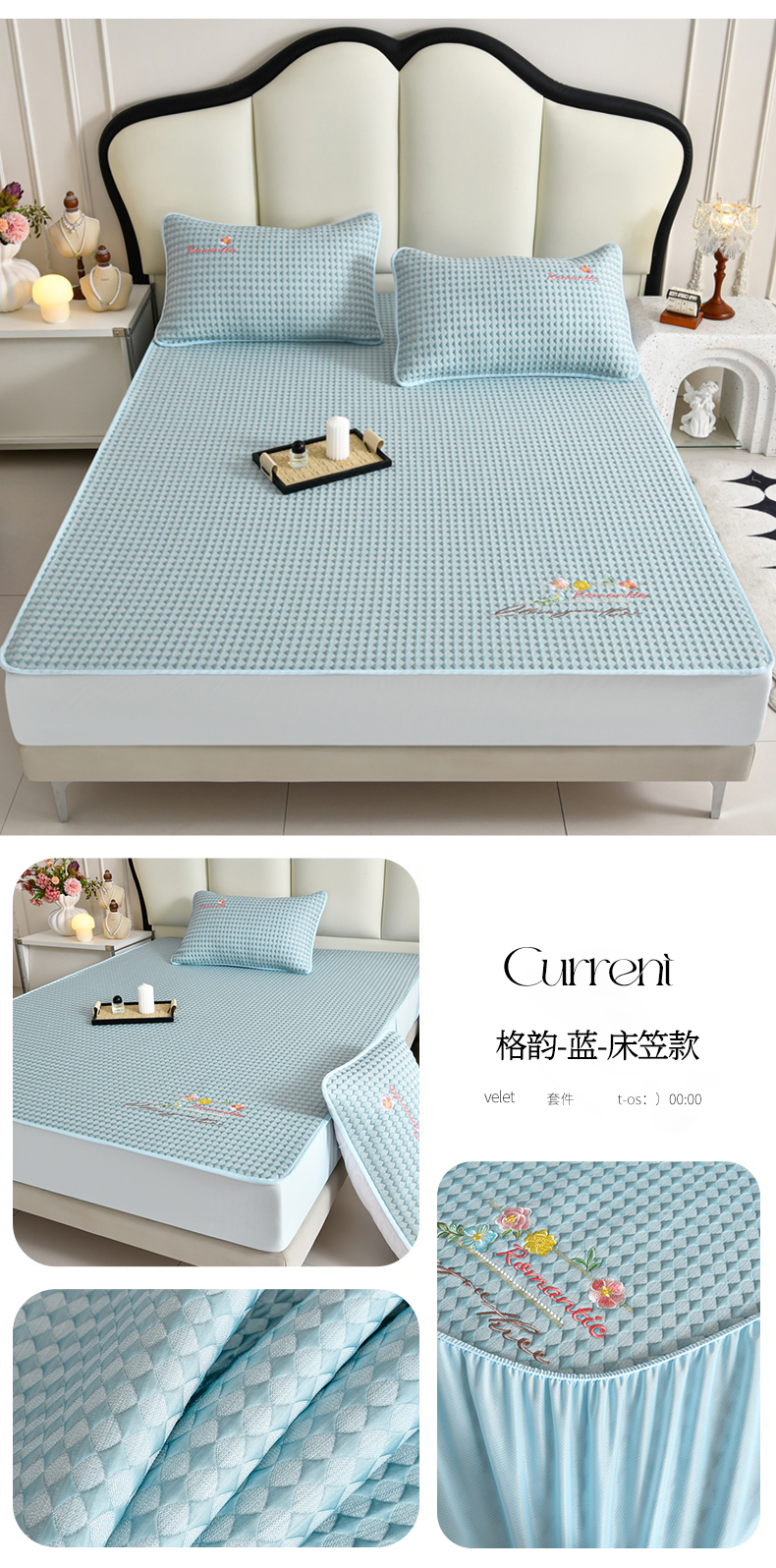 商品名称:梦之星 2026新款PE凉感豆豆凉席绣花三明治复合床笠款三件套 格韵-蓝-床笠款