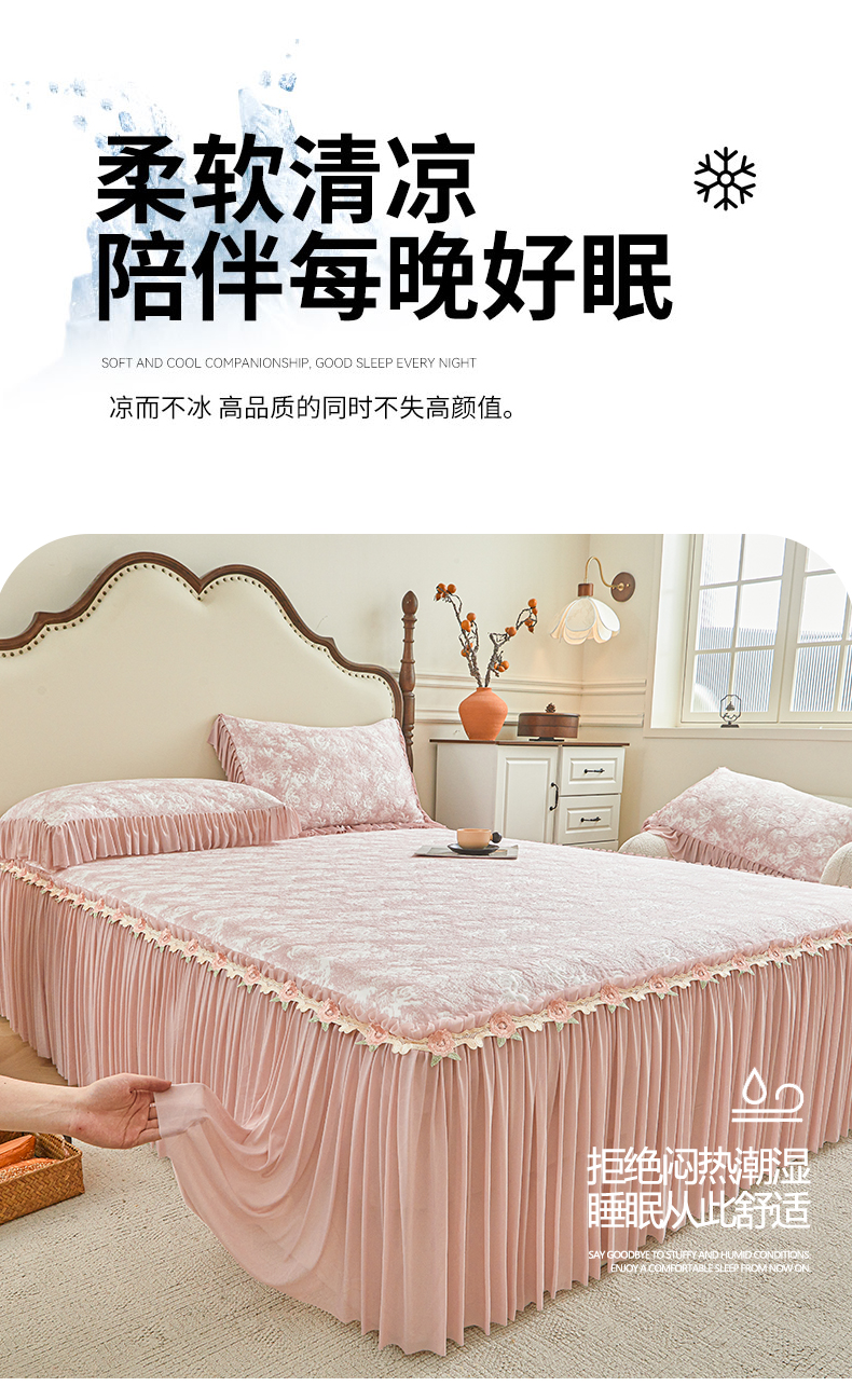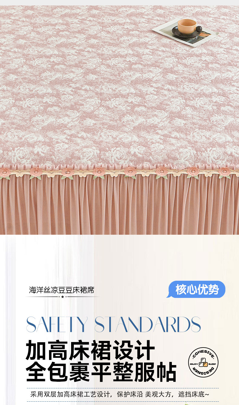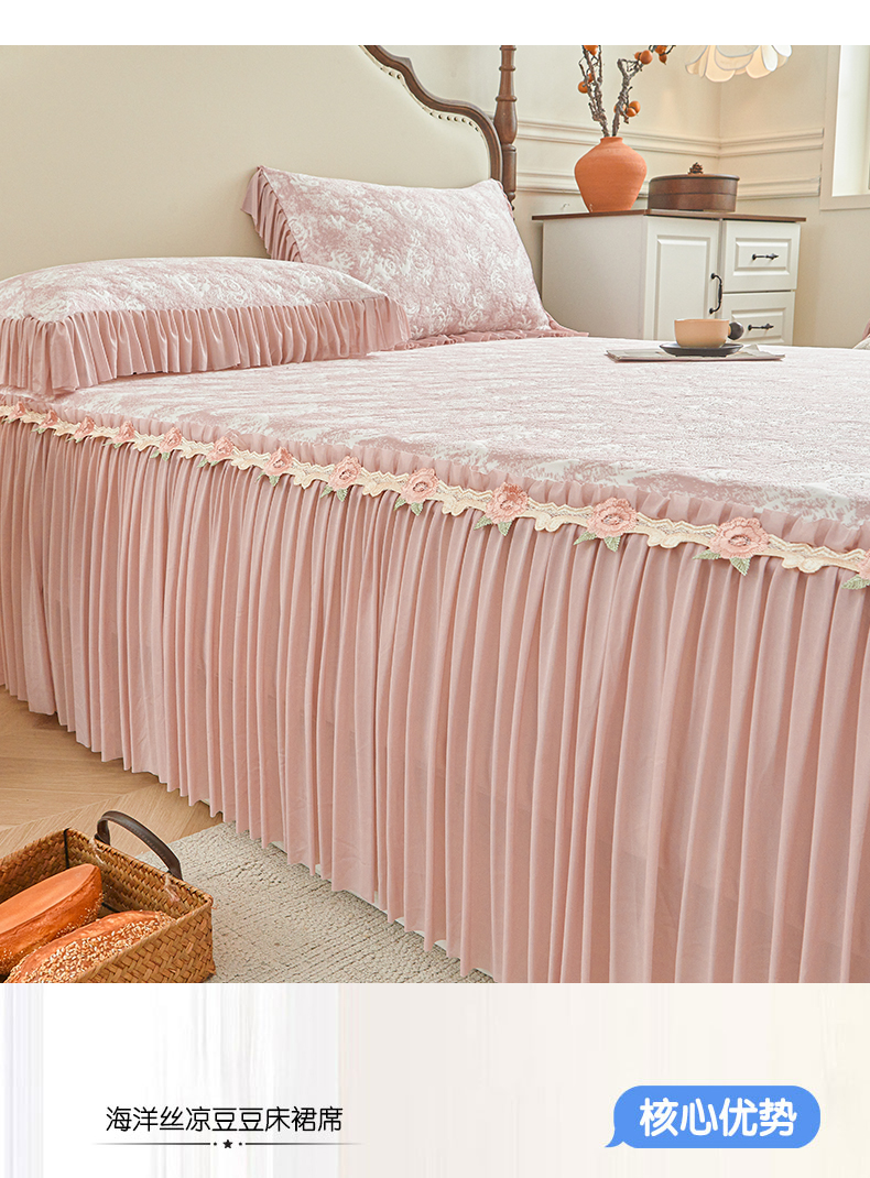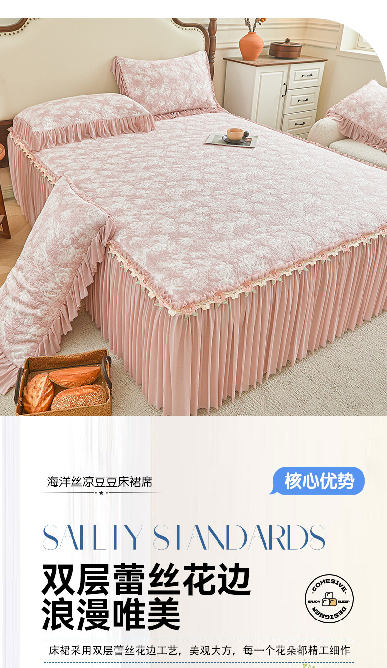 (总)好儿喜家纺 2026新款A类海洋丝豆豆床裙凉席席子凉席三件套-莫奈玫瑰