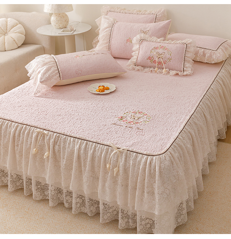 (总)好儿喜家纺 2024新款伊芙琳凉席床裙三件套,浅绿,橄榄绿,奶白,浅粉,浅蓝