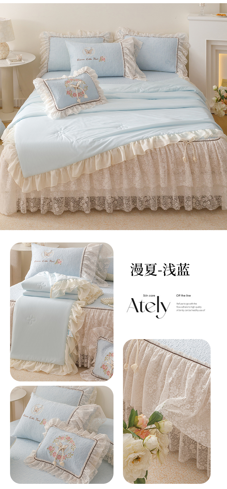 (总)好儿喜家纺 2024新款伊芙琳夏被凉席床裙四件套,浅绿,橄榄绿,奶白,浅粉,浅蓝