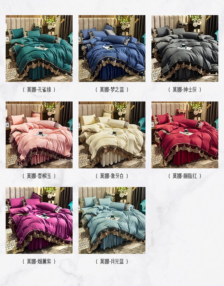(总)莉莉安 2025新款亲肤磨毛欧式花边床裙四件套,莫娜-孔雀绿,莫娜-梦之蓝,莫娜-绅士灰,莫娜-香槟玉,莫娜-象牙白,莫娜-胭脂红,莫娜-烟薰紫,莫娜-月光蓝