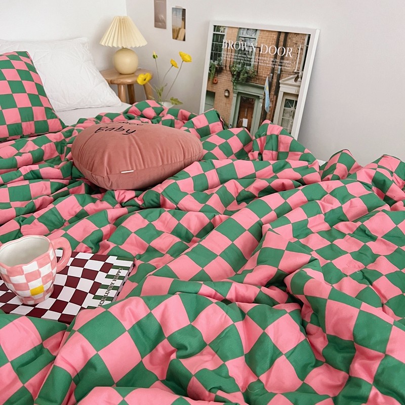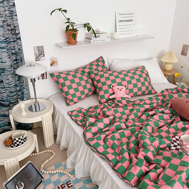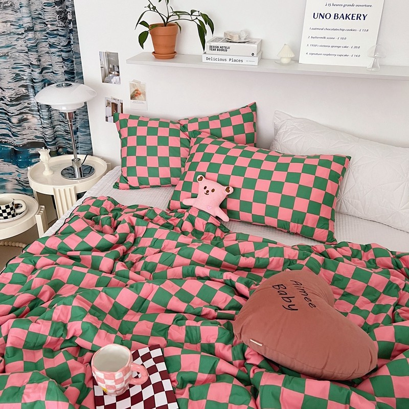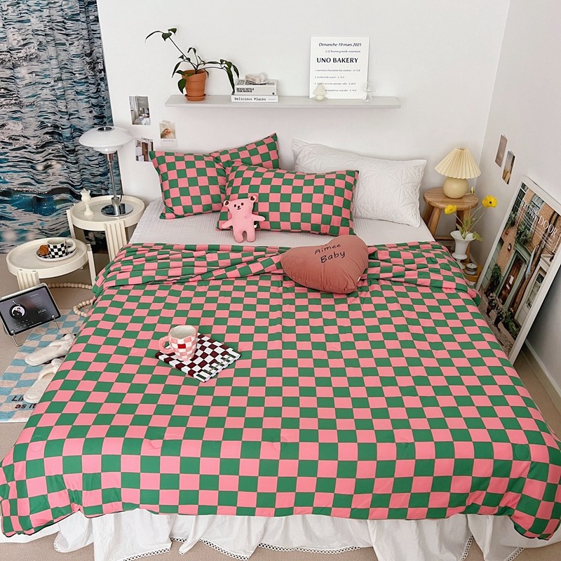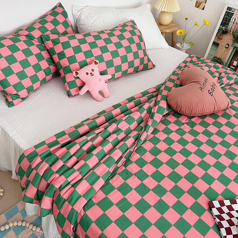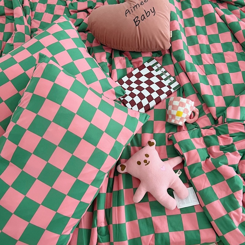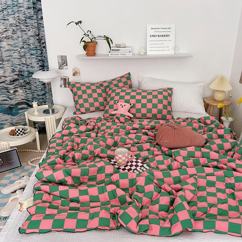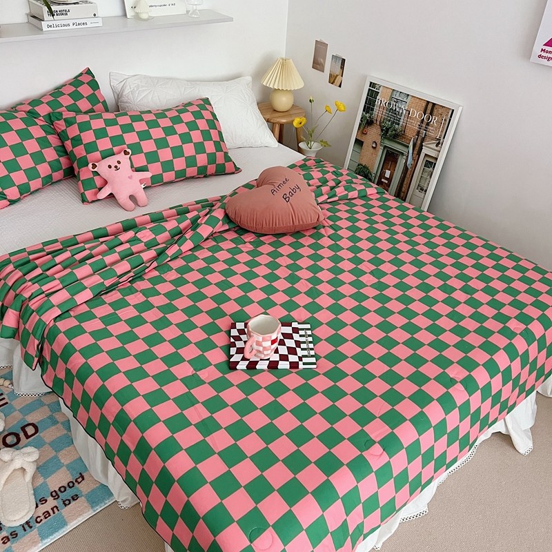 星期八 2022新款棋盘格针织棉夏被 玫红绿格