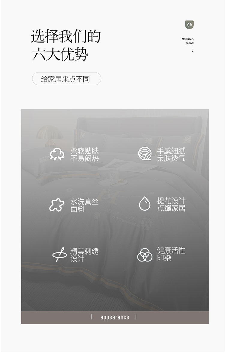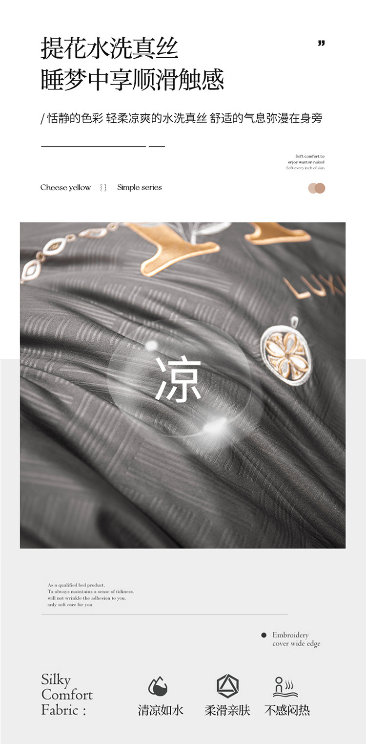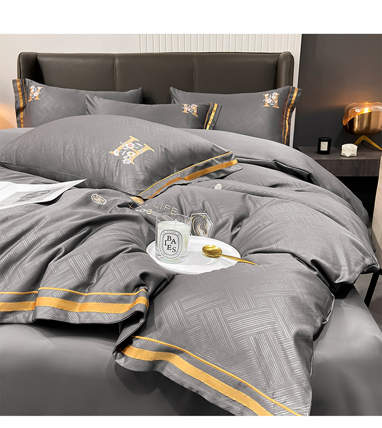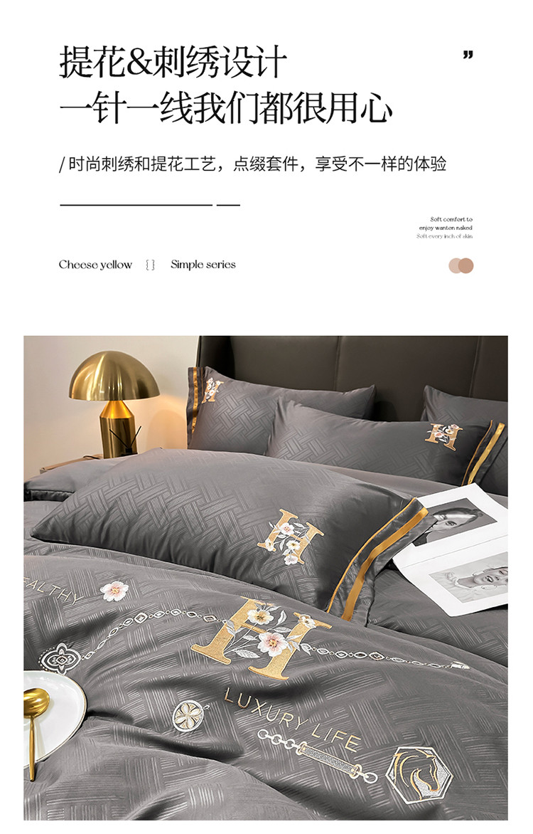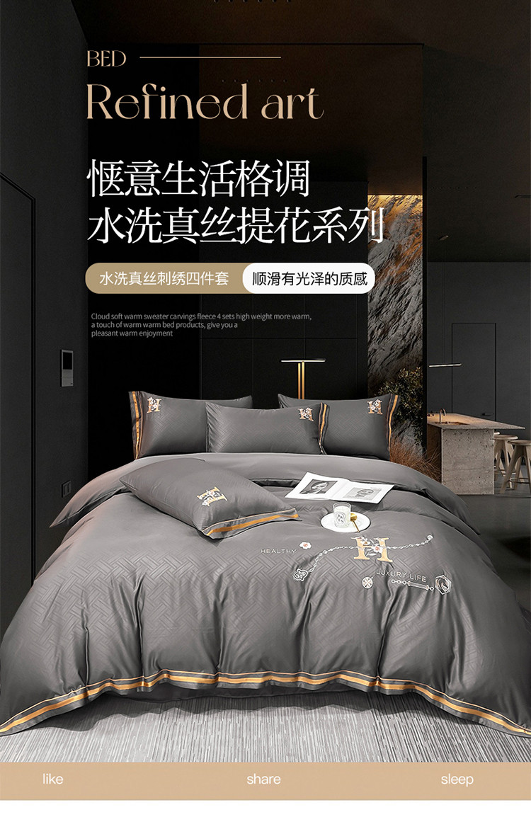 商品名称:嗯呢 2023新款刺绣H款轻奢提花水洗真丝四件套提花-高级灰