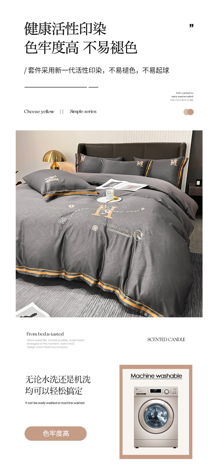 嗯呢 2023新款刺绣H款轻奢提花水洗真丝四件套提花-高级灰