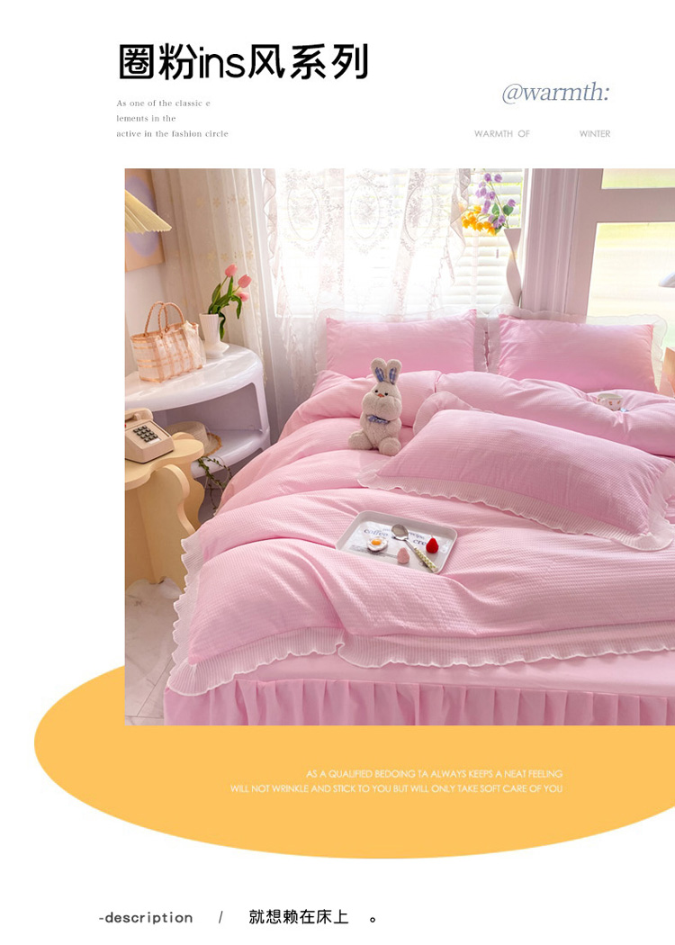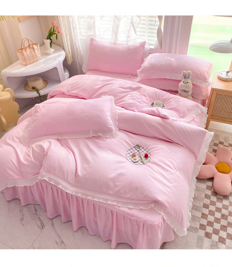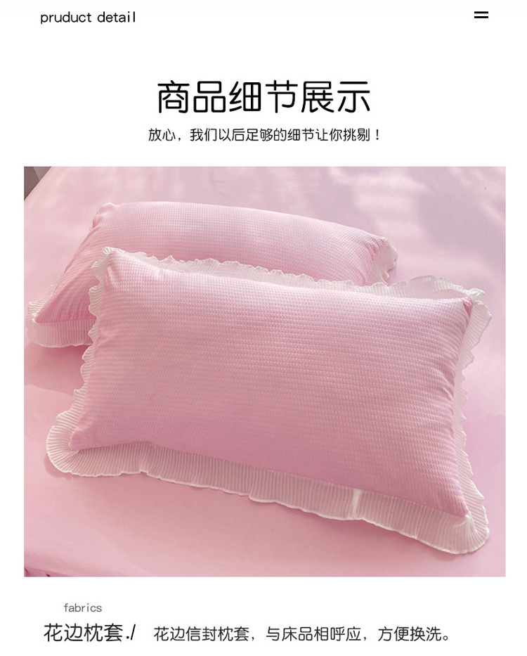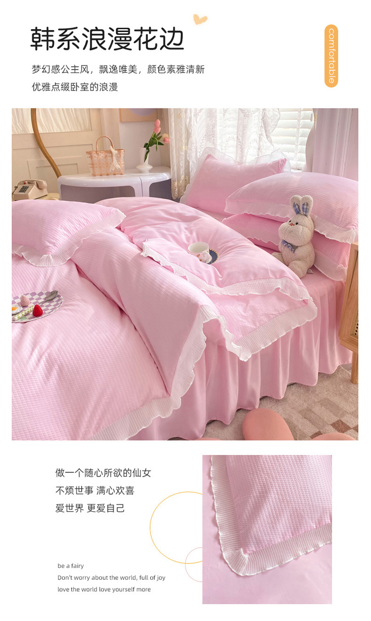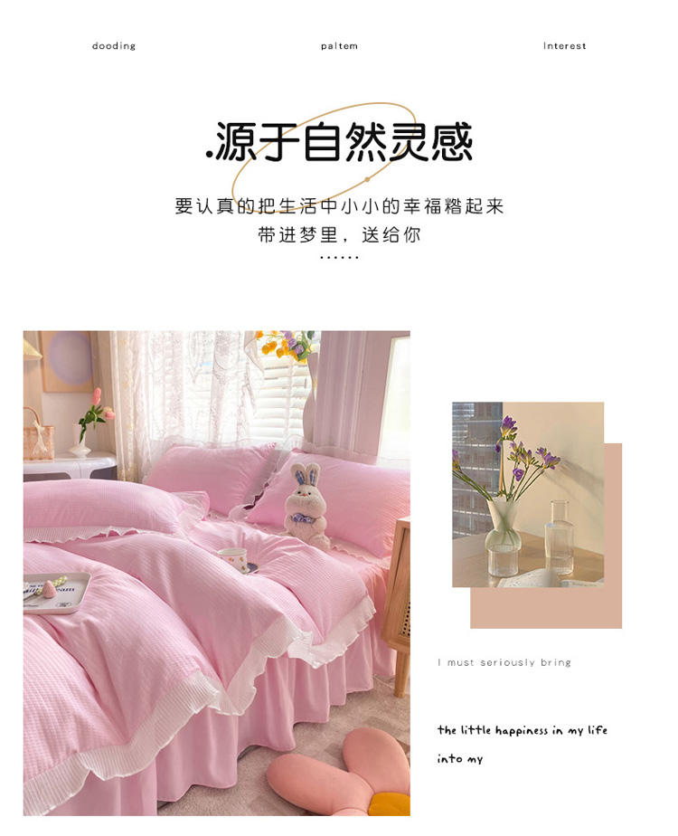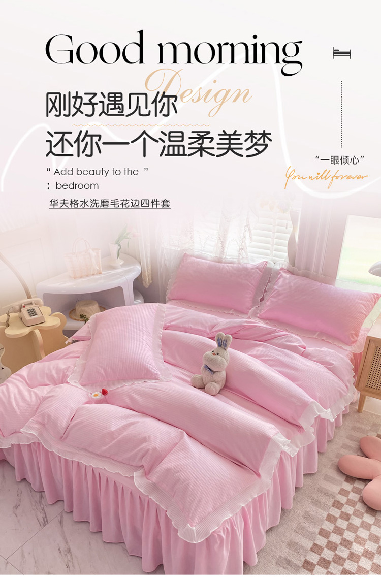 当前位置: 91家纺网 > 商品网购 > 床品套件 > 四件套 > 普通磨毛四件套 > 慕澄家纺 2022新款华夫格雪纺花边四件套 樱花粉
