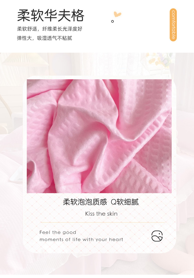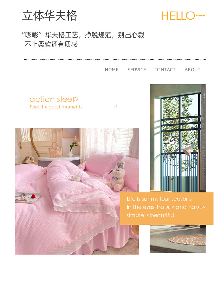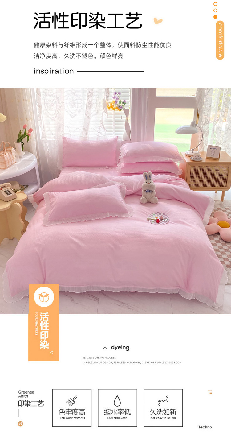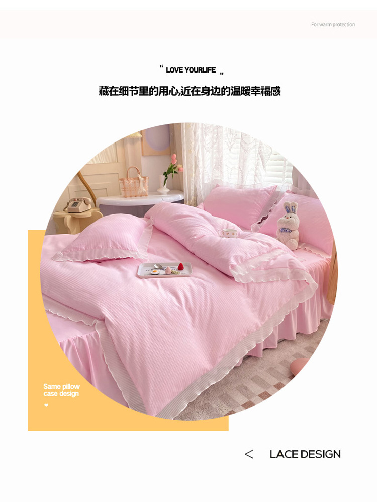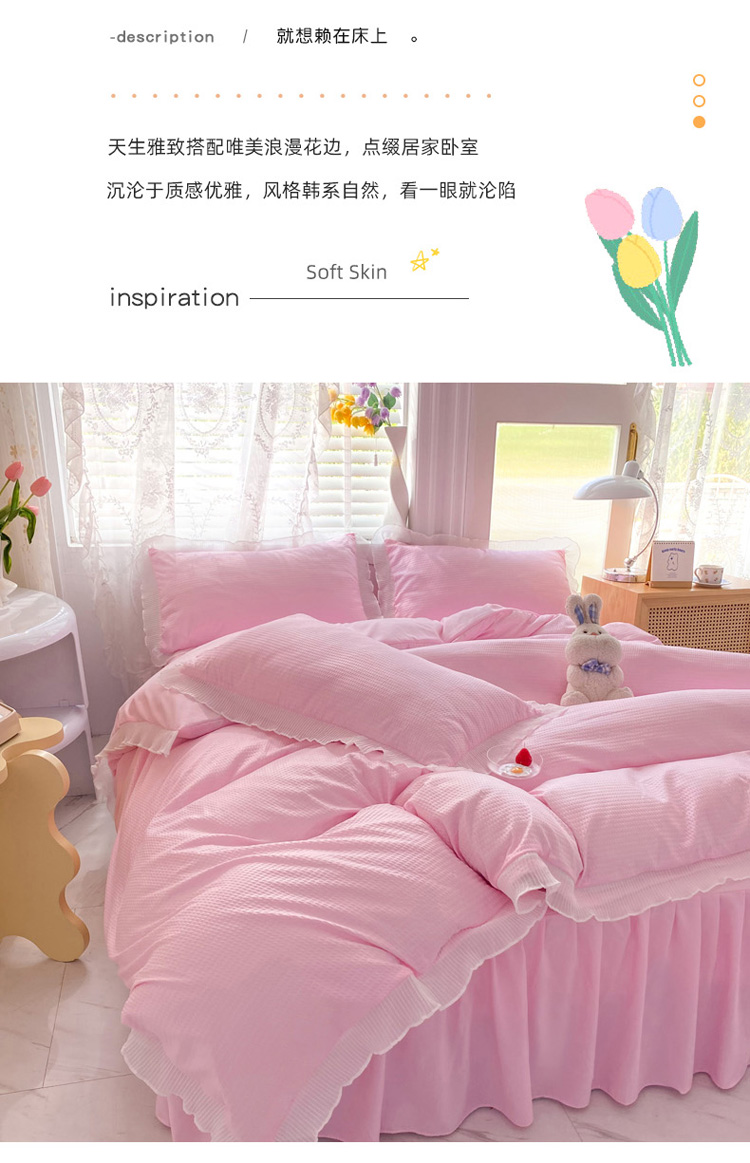 当前位置: 91家纺网 > 商品网购 > 床品套件 > 四件套 > 普通磨毛四件套 > 慕澄家纺 2022新款华夫格雪纺花边四件套 樱花粉