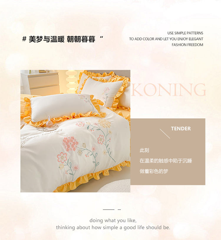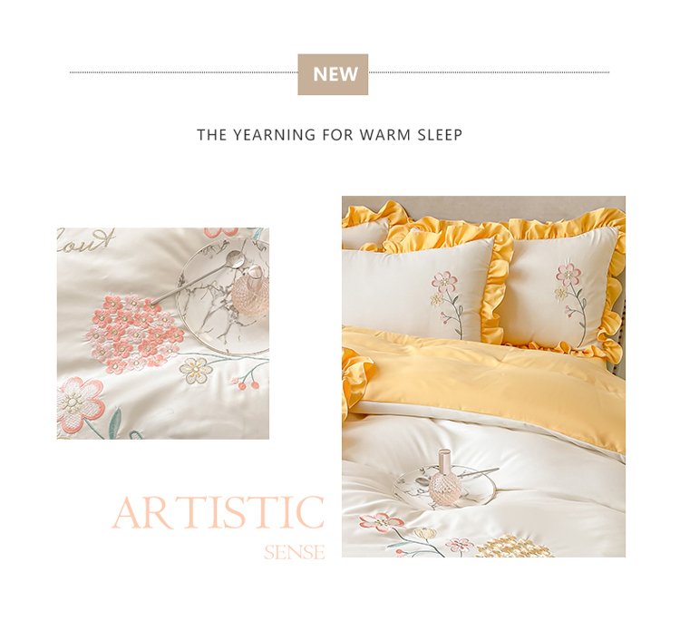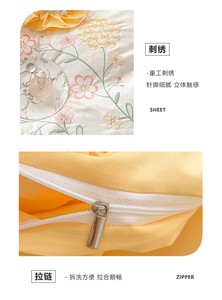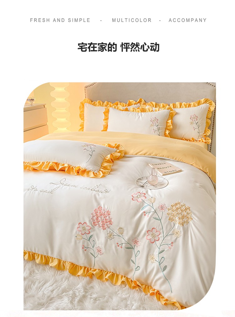 (总)富盛 2024新款水洗亲肤棉刺绣公主风四件套-春暖花开,浅绿+深绿,紫黄,浅绿,粉玉,白粉,粉绿,黄蓝,大红