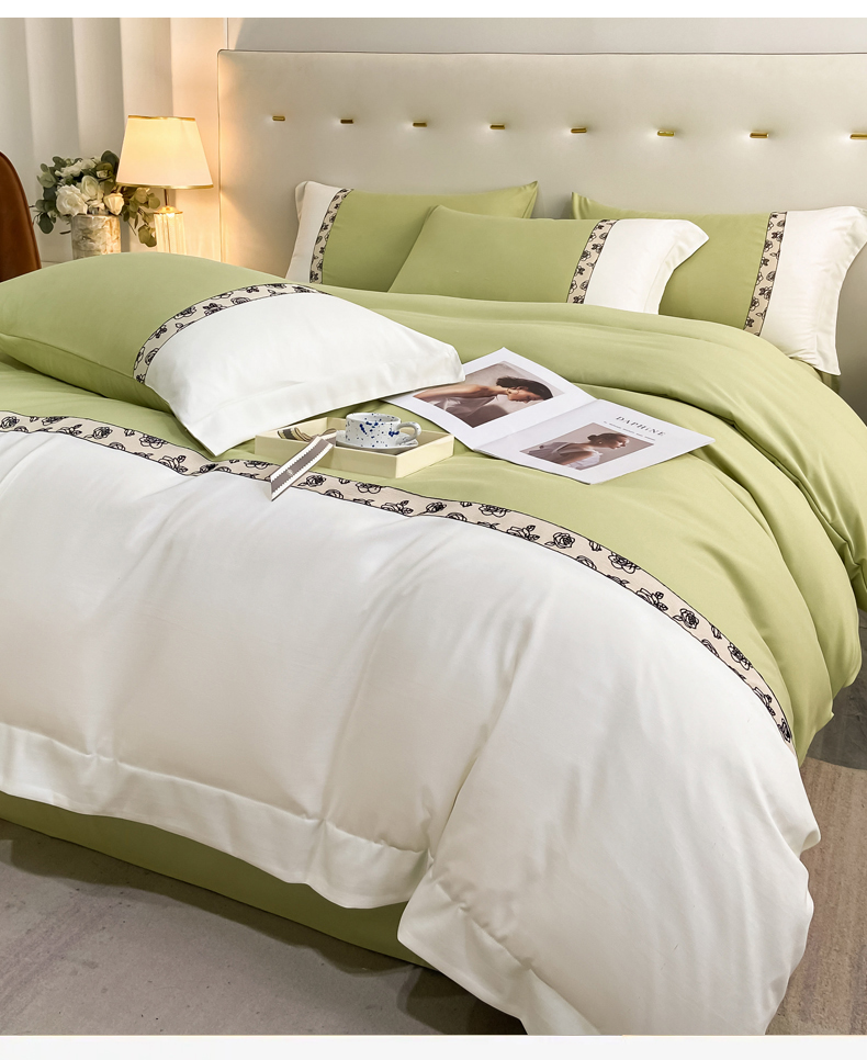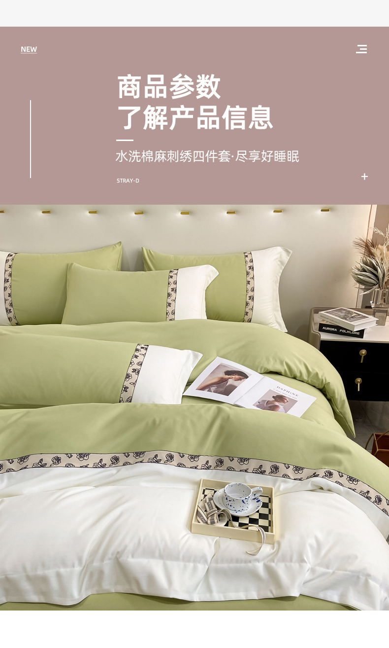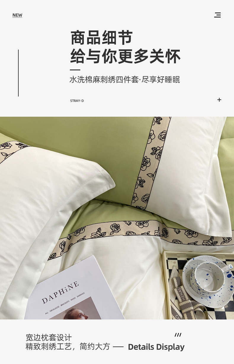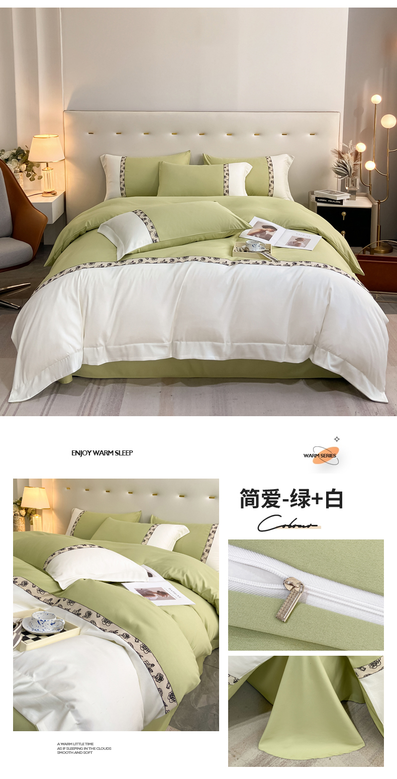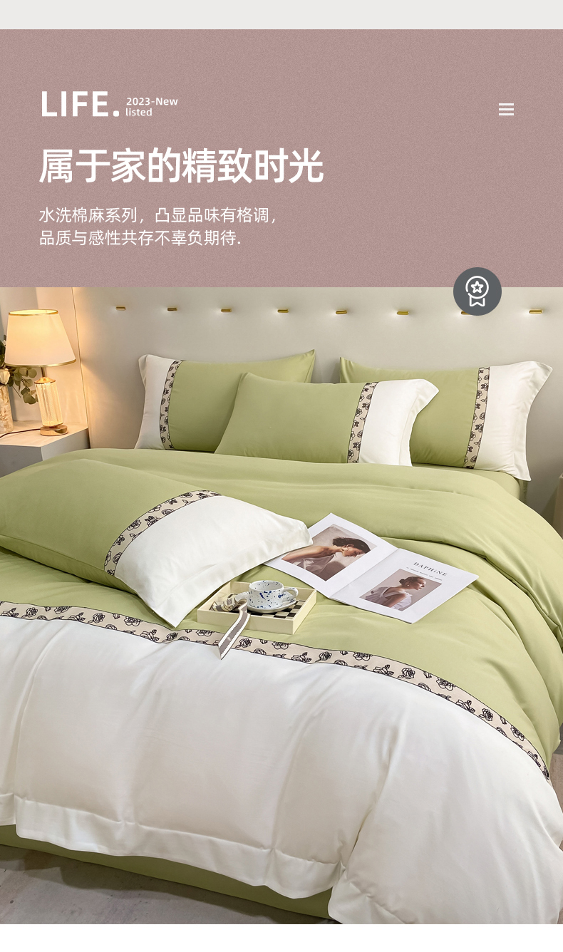 绒世界2024新款水洗棉麻印花四件套-简爱系列 简爱-绿+白