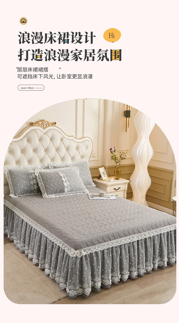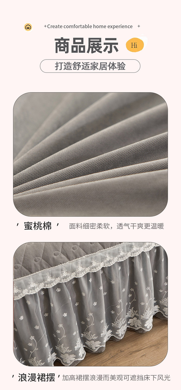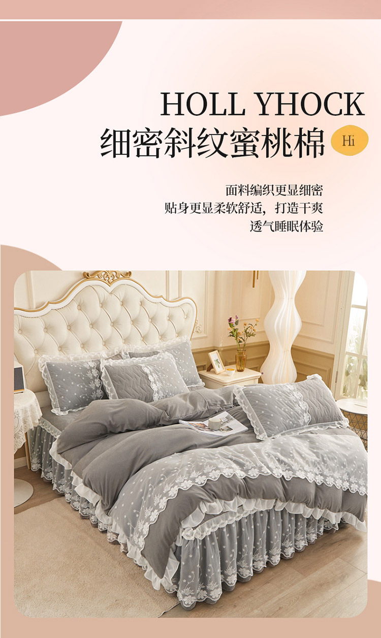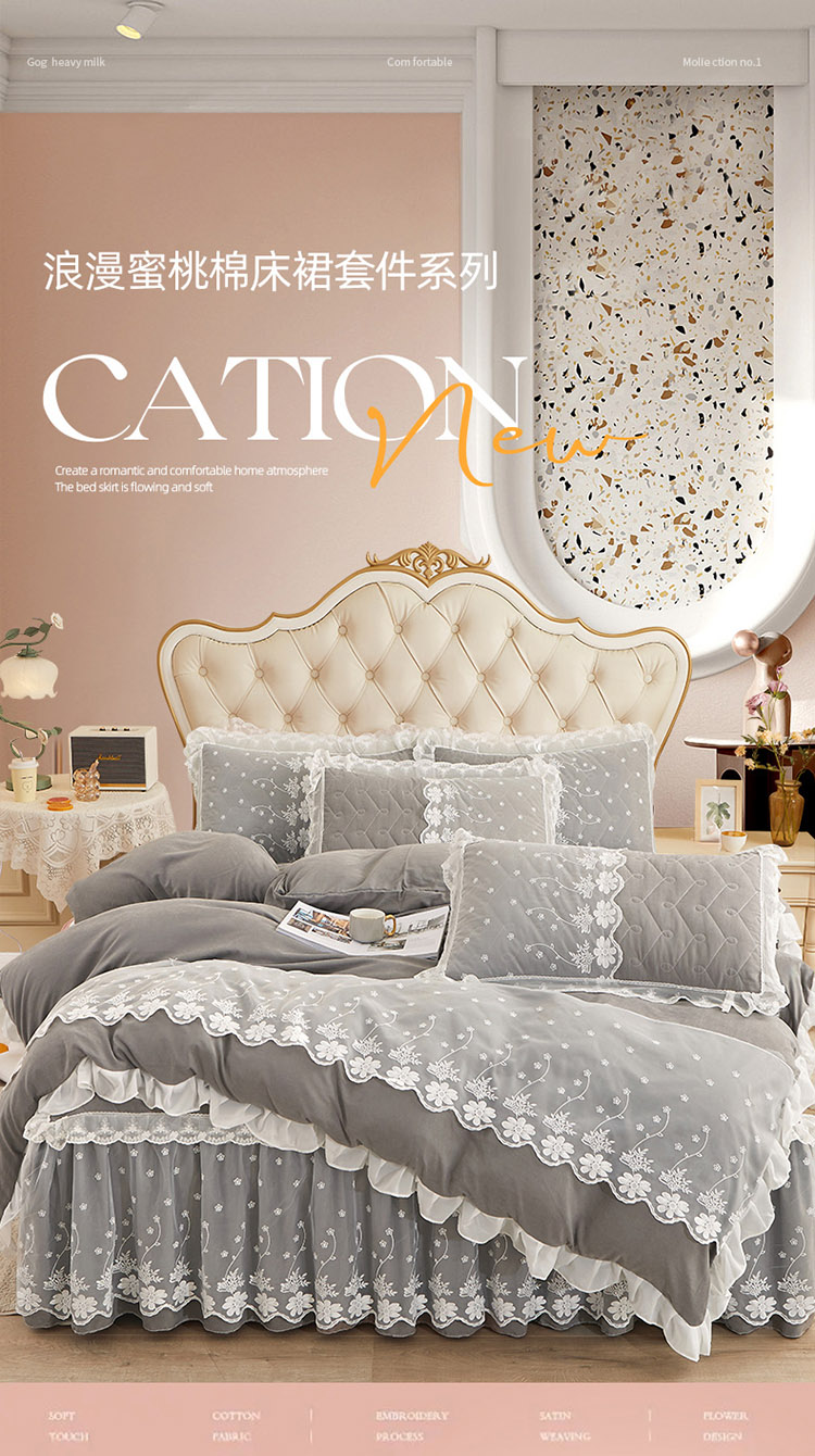 当前位置: 91家纺网 > 商品网购 > 床品套件 > 四件套 > 全棉普通四件套 > 恋尚 2023新款蜜桃棉夹棉床裙款四件套 花婷-灰色