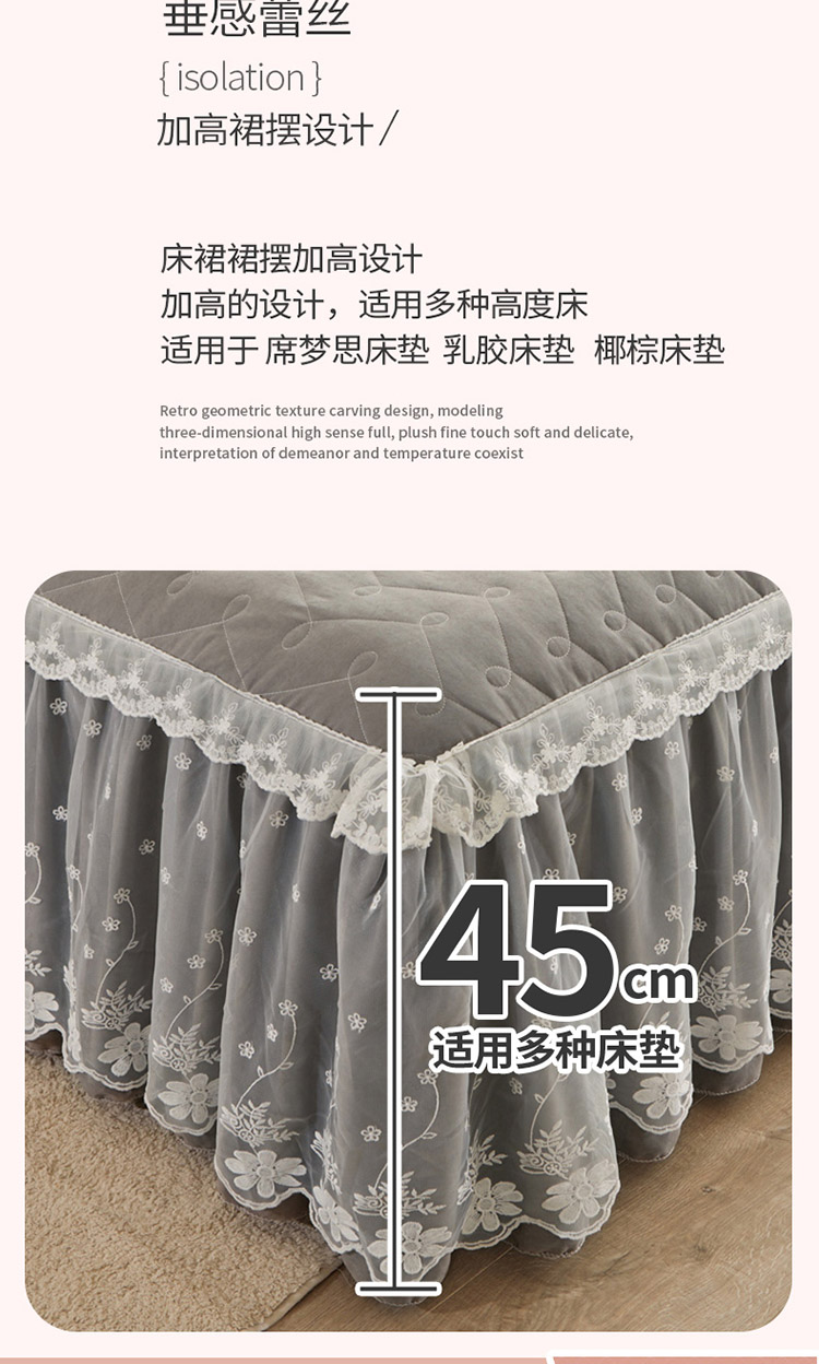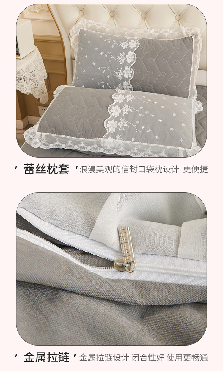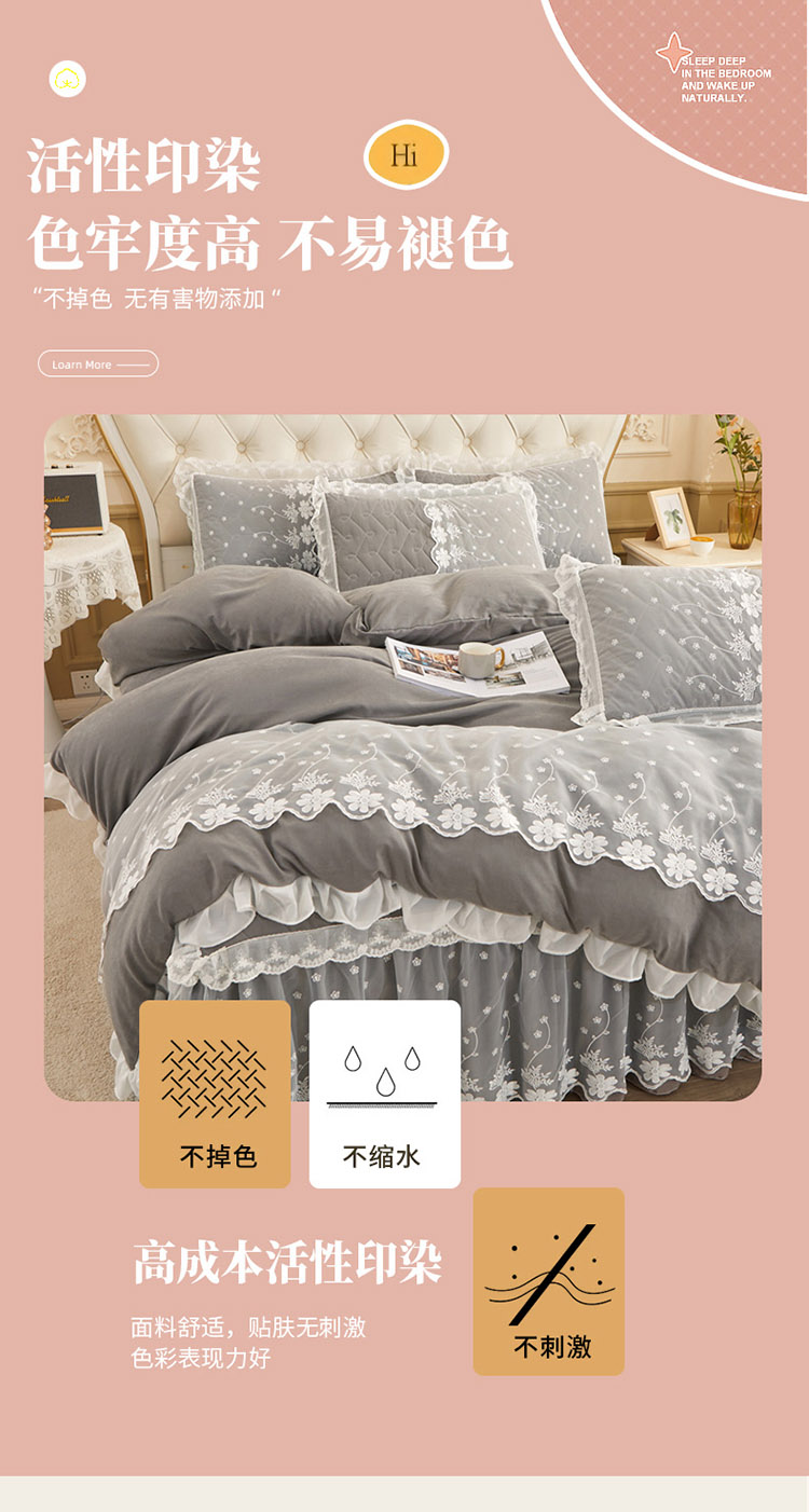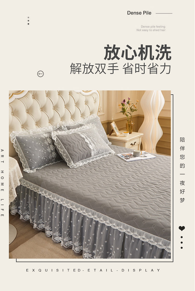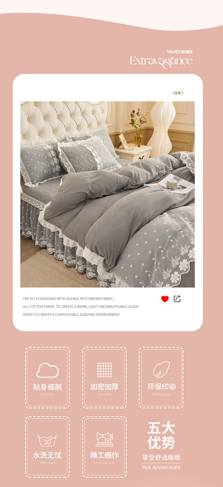 当前位置: 91家纺网 > 商品网购 > 床品套件 > 四件套 > 全棉普通四件套 > 恋尚 2023新款蜜桃棉夹棉床裙款四件套 花婷-灰色