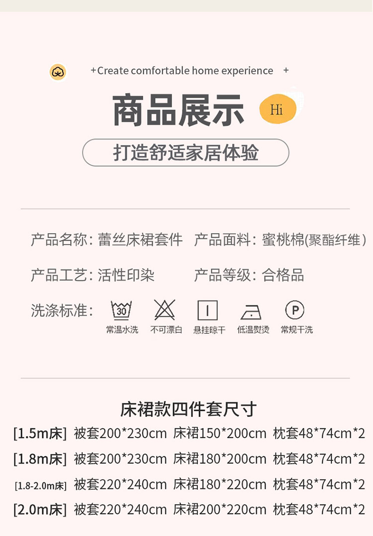 1.5m床裙款四件套(被套200*230cm床裙150*200cm枕套48*74cm*2) | ¥190.00 |