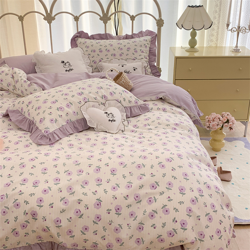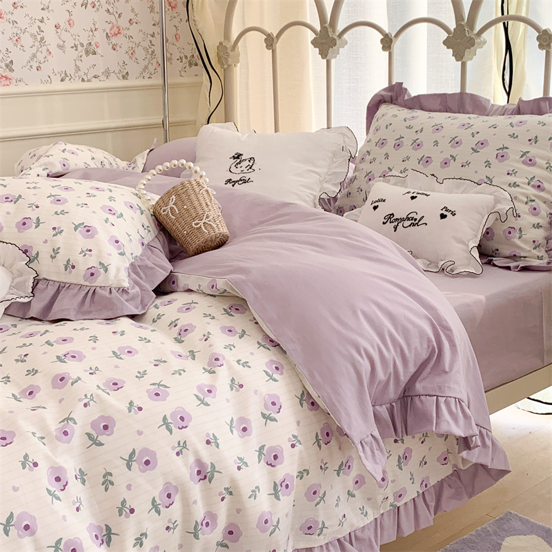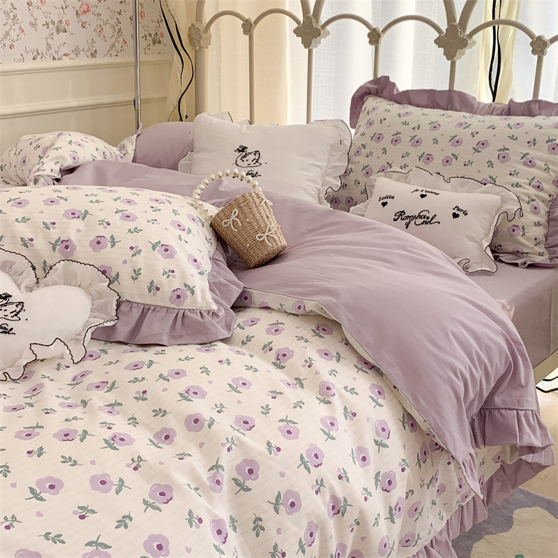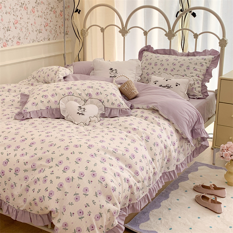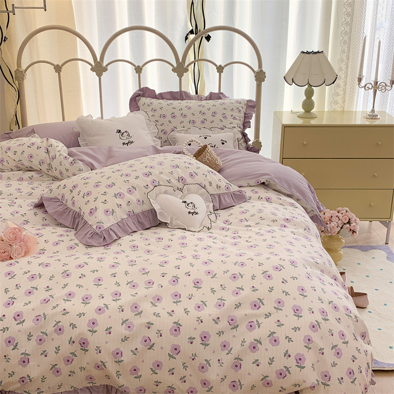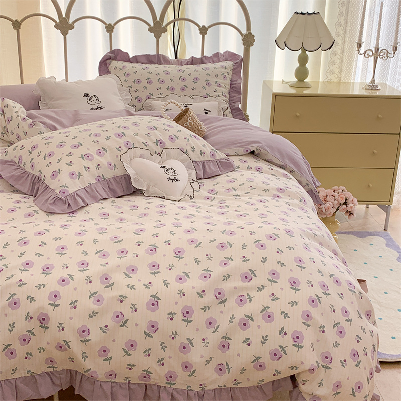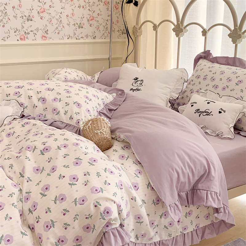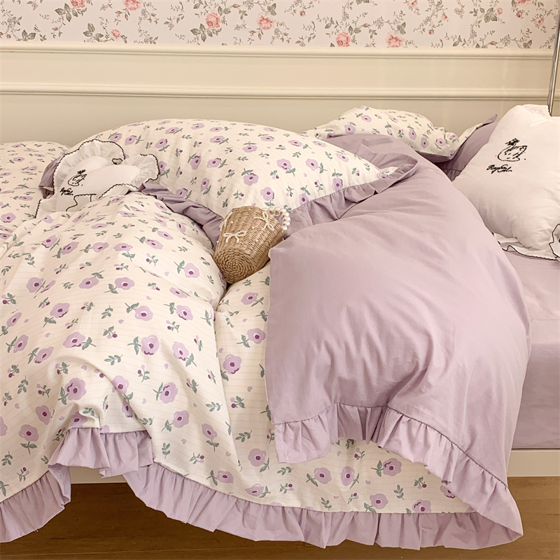 昔可家纺 韩版对折褶皱花边全棉四件套ok 香草甜心紫