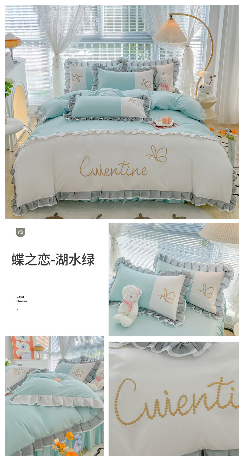当前位置: 91家纺网 > 商品网购 > 床品套件 > 四件套 > 普通磨毛四件套 > 慕语2023新款蝶之恋刺绣磨毛花边四件套 蝶之恋-湖水绿