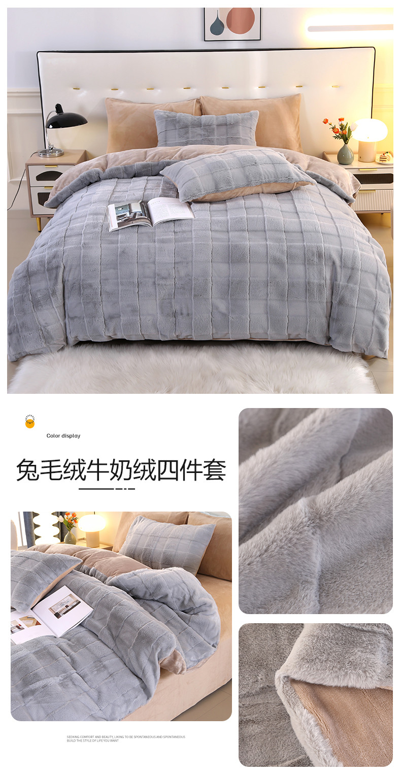 商品名称:富之航家纺 2023新款兔毛牛奶绒四件套 雾霾蓝+卡其
