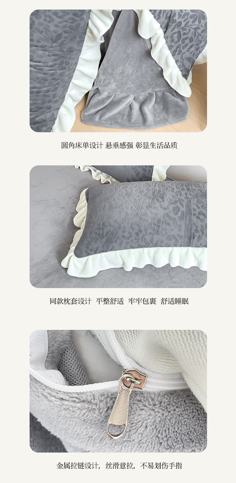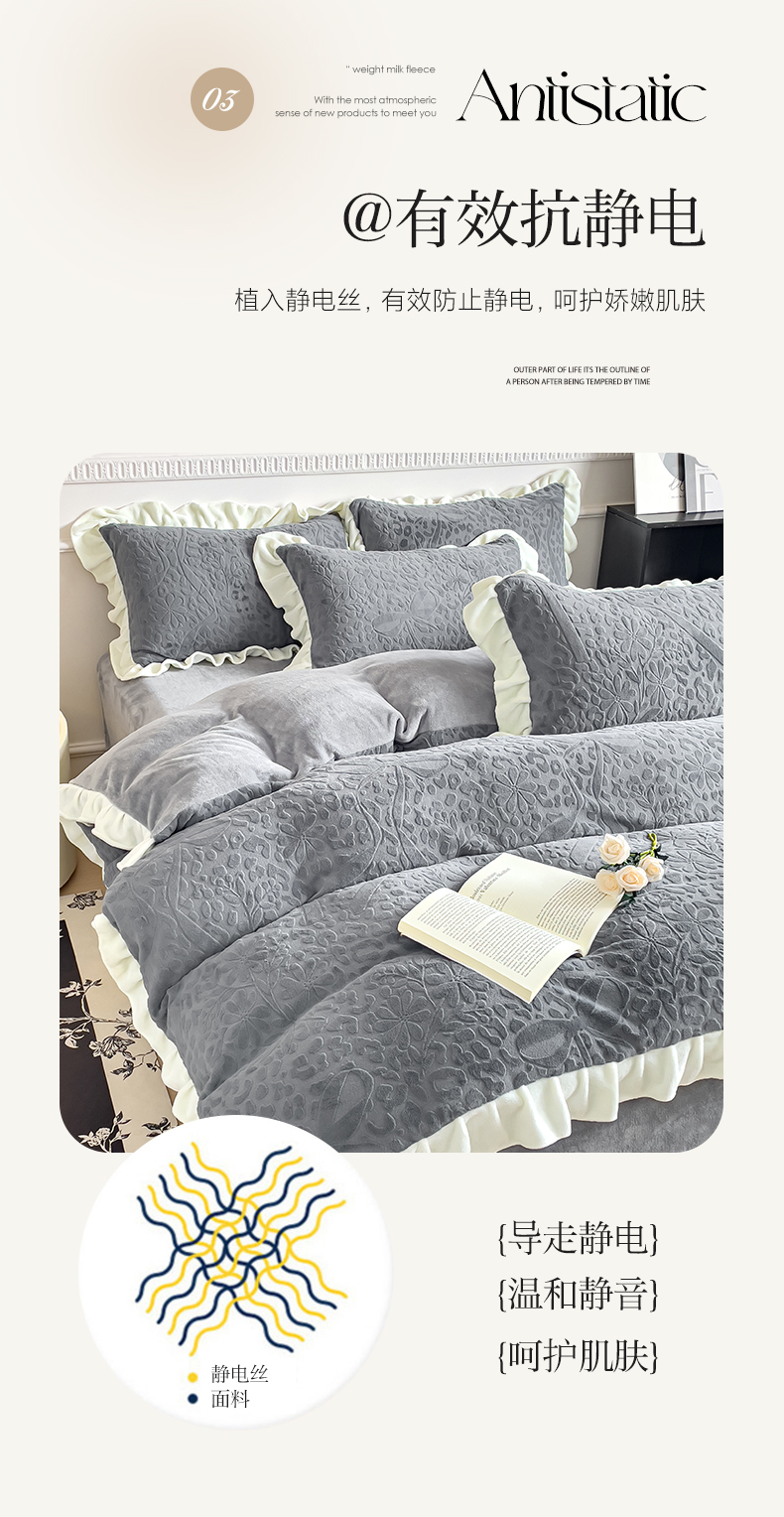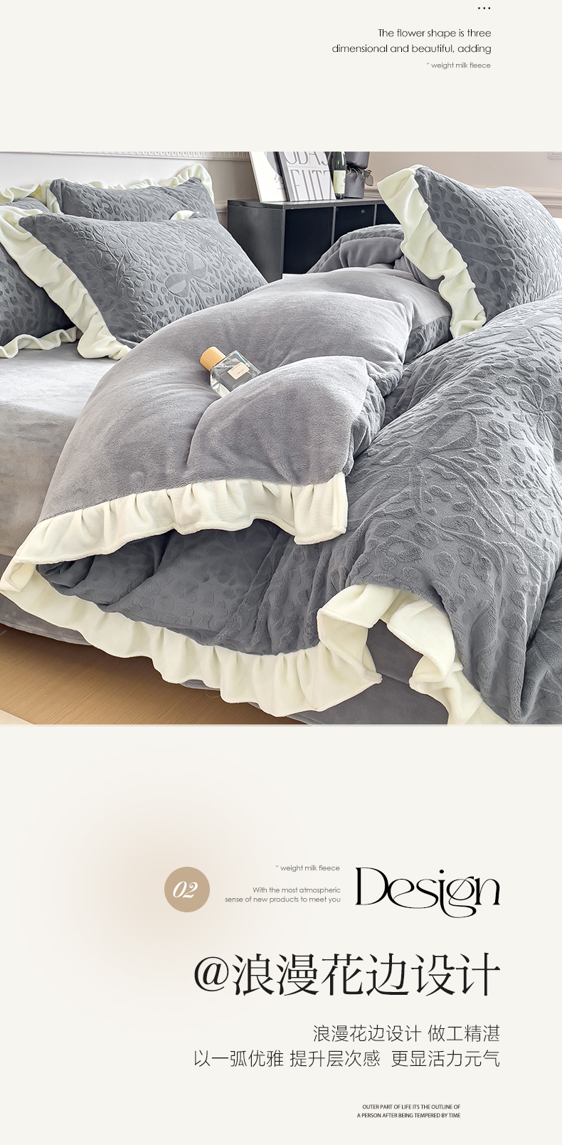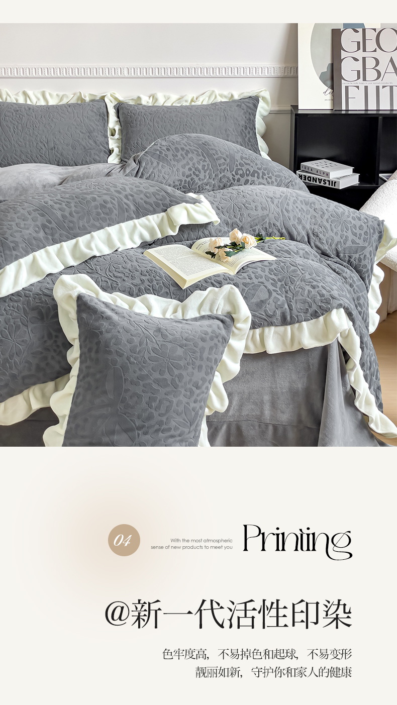 商品名称:铠畅家纺 2023新款花边雕花牛奶绒四件套-飘逸系列 飘逸-灰