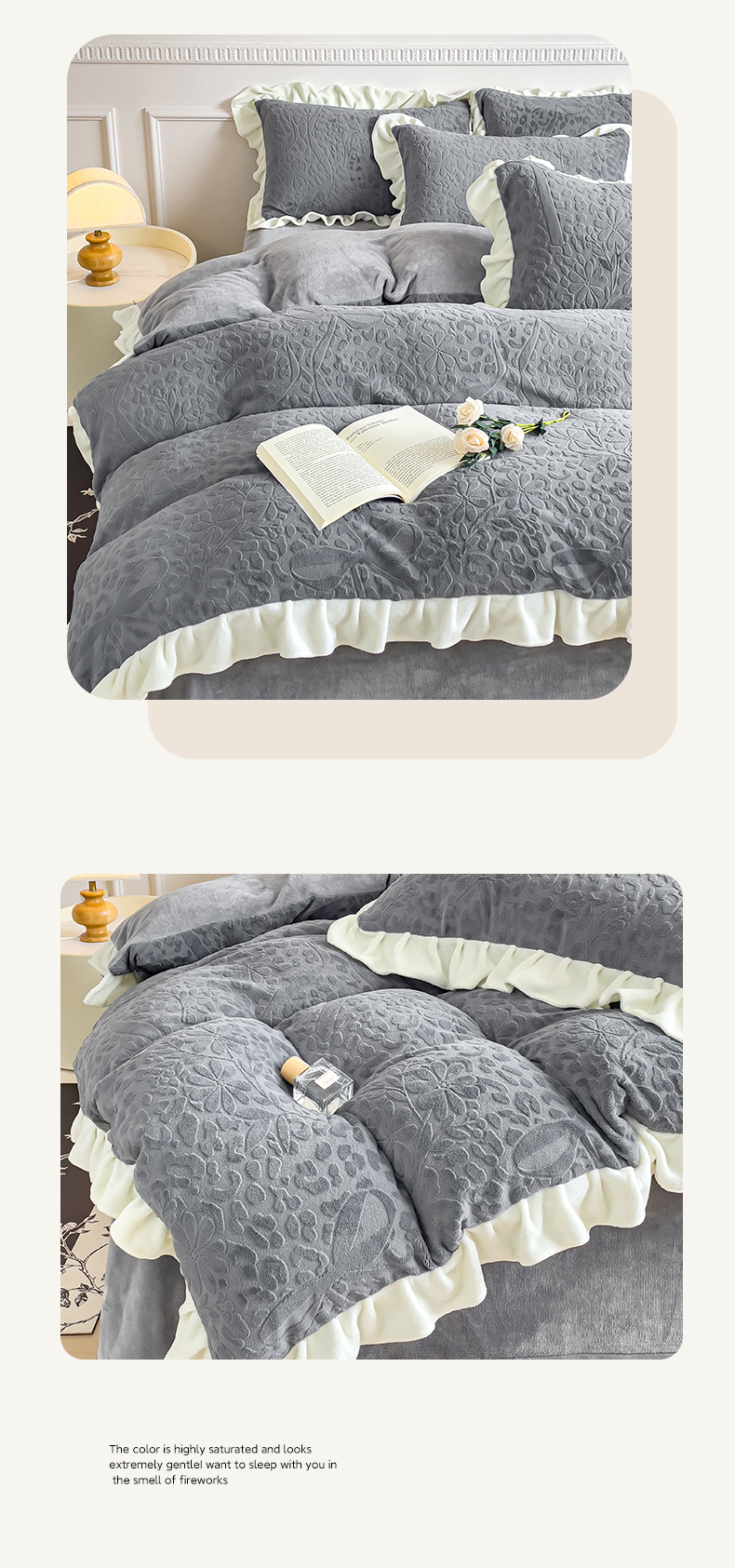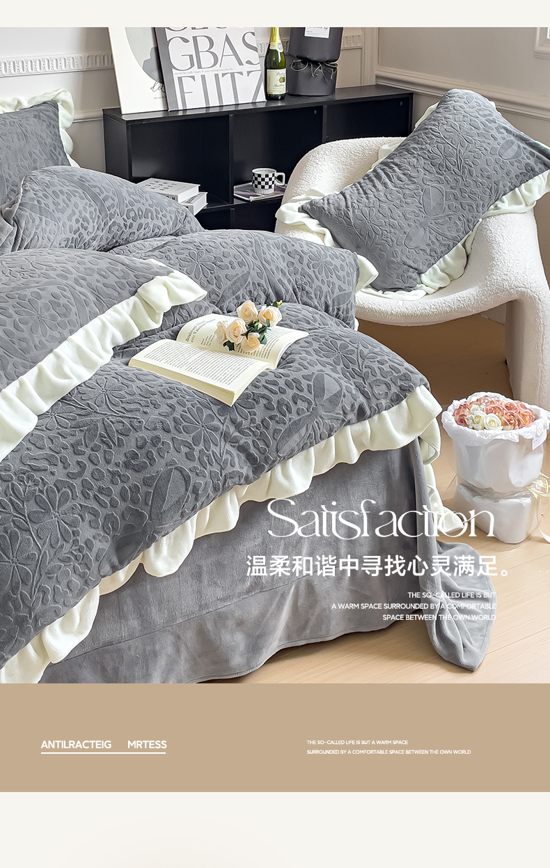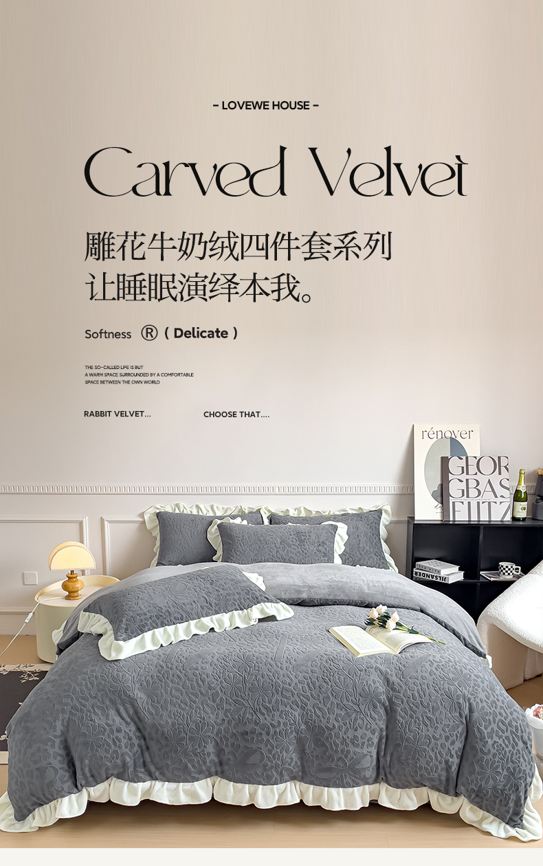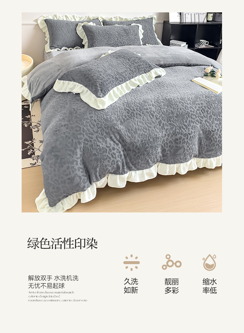 商品名称:铠畅家纺 2023新款花边雕花牛奶绒四件套-飘逸系列 飘逸-灰