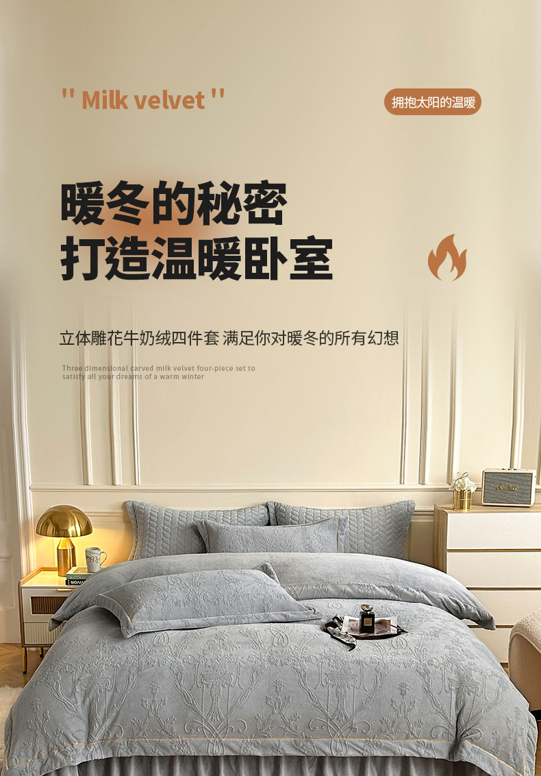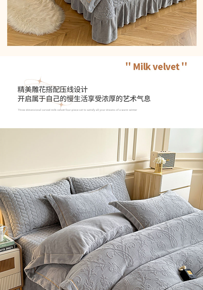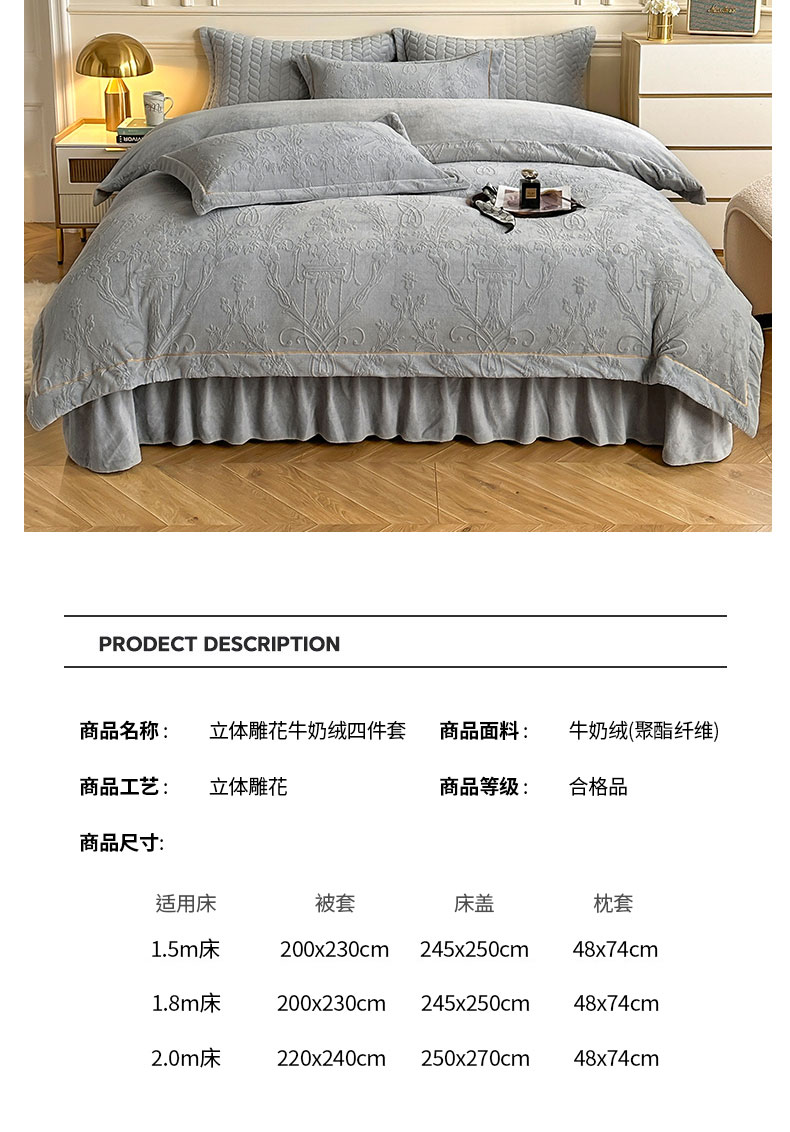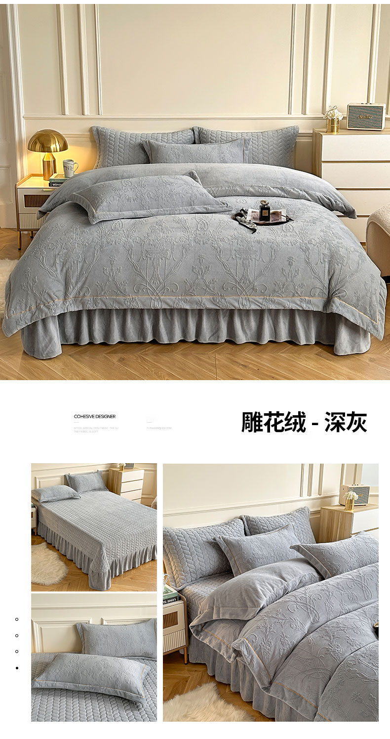 商品名称:金艾草 2023新款牛奶绒立体雕花夹棉床盖四件套 雕花绒-深灰