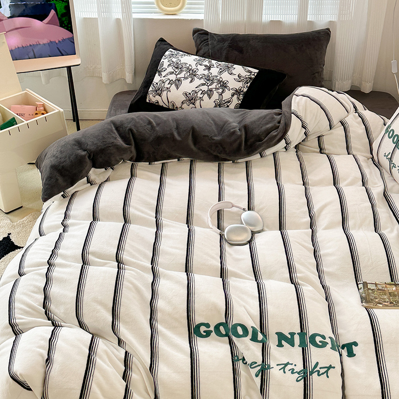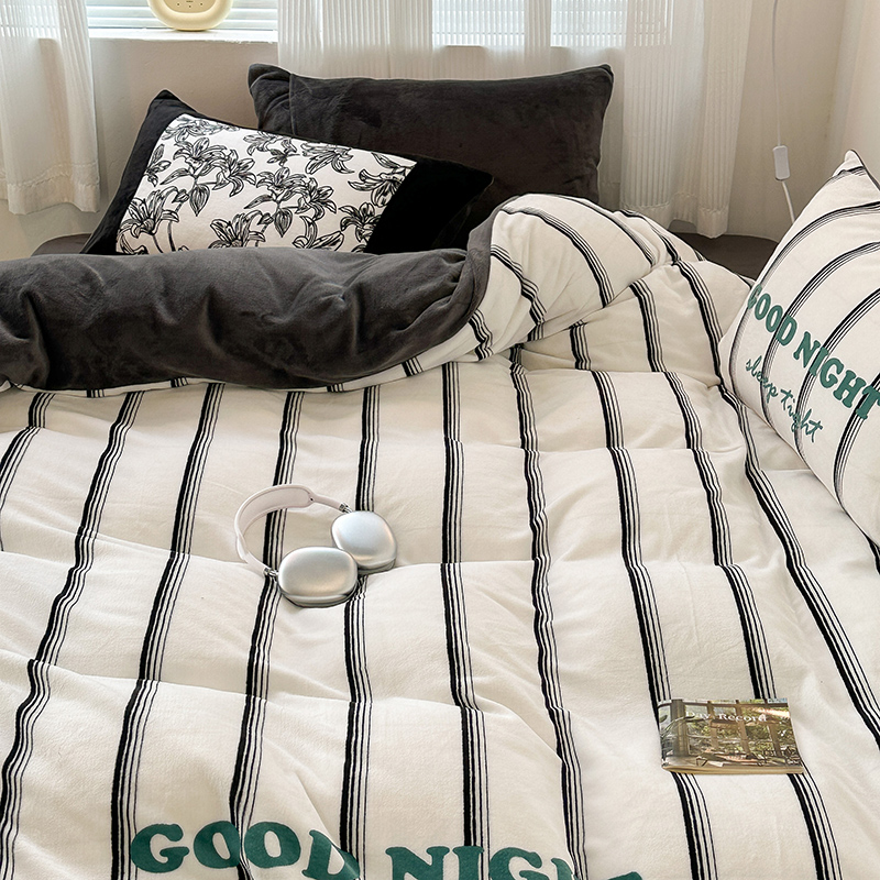 昔可家纺 2023新款大版数码印花保暖牛奶绒四件套 黑条茶歇花
