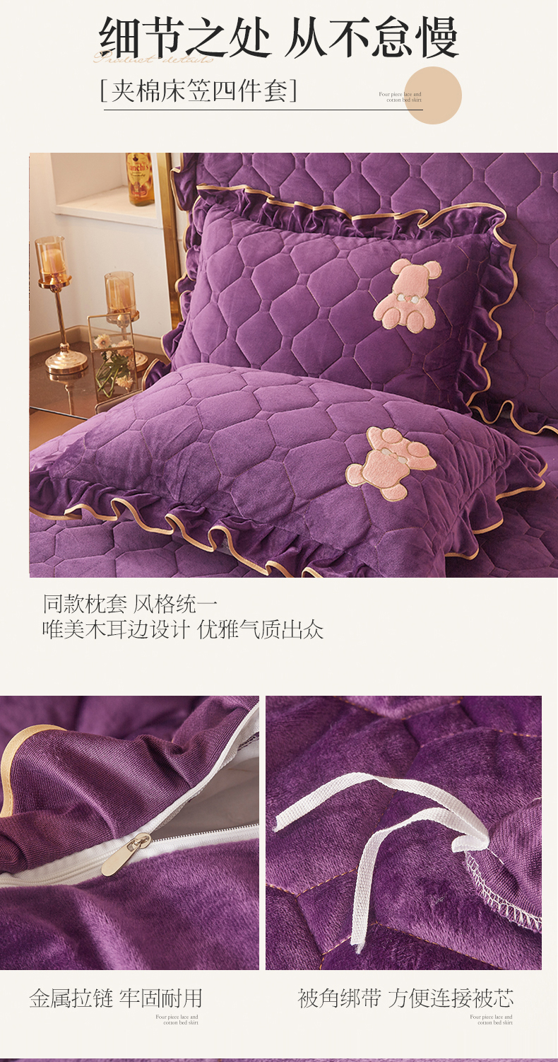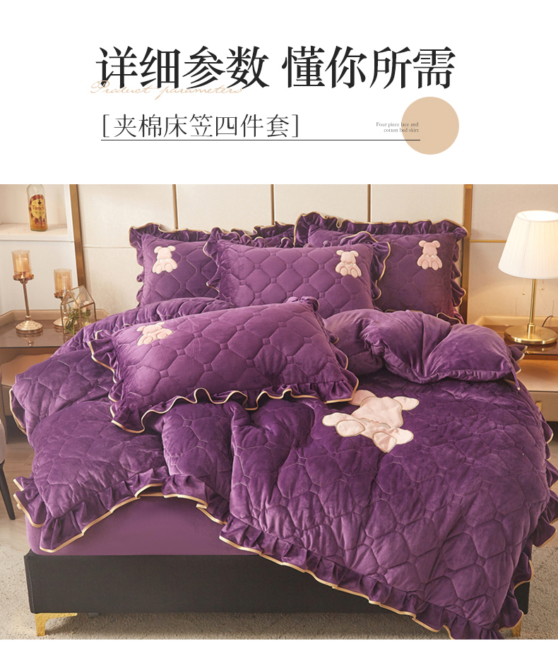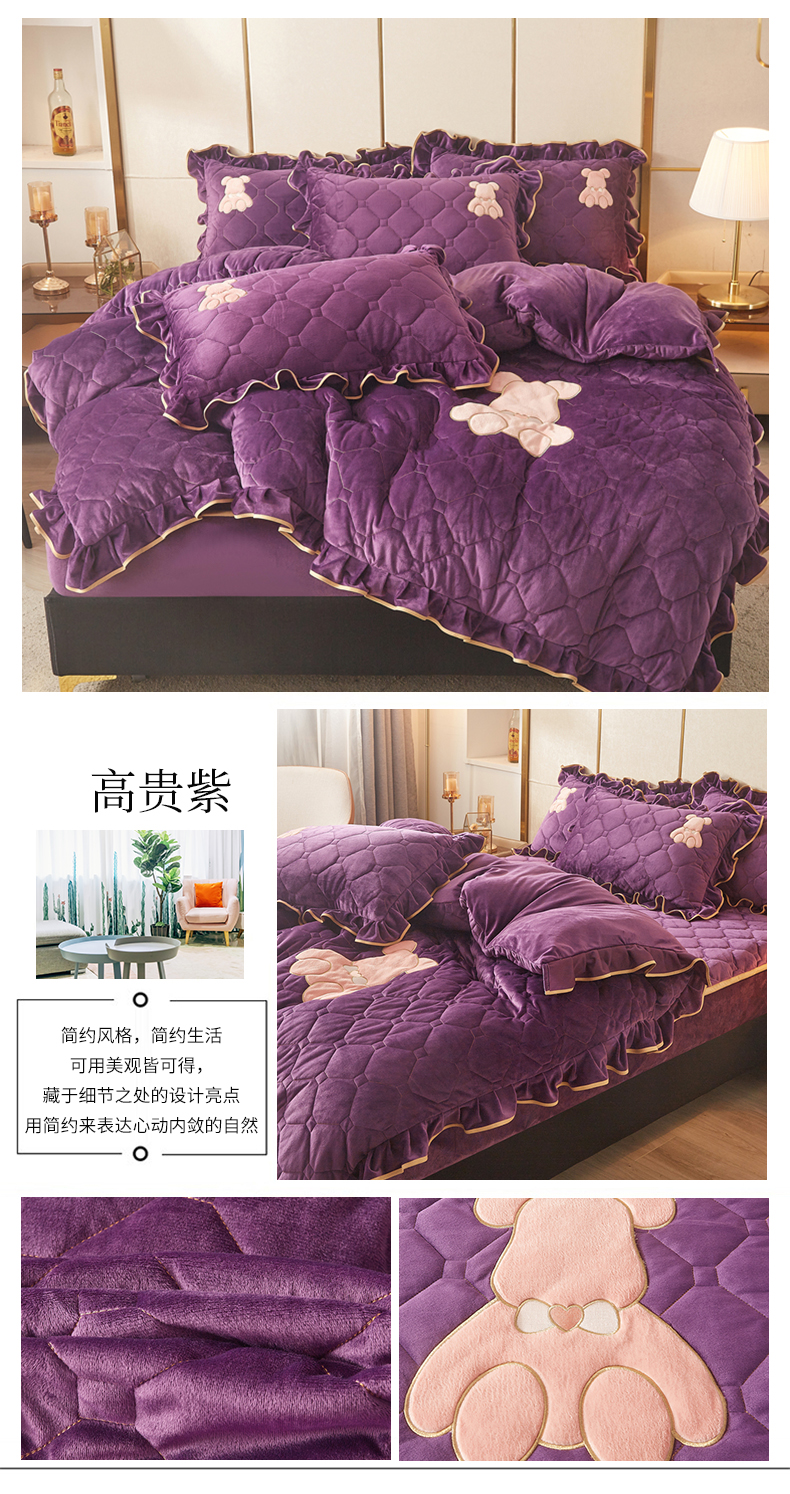 商品名称:屹成 2024新款水晶绒夹棉床笠款四件套贴布绣款-小熊款 高贵紫