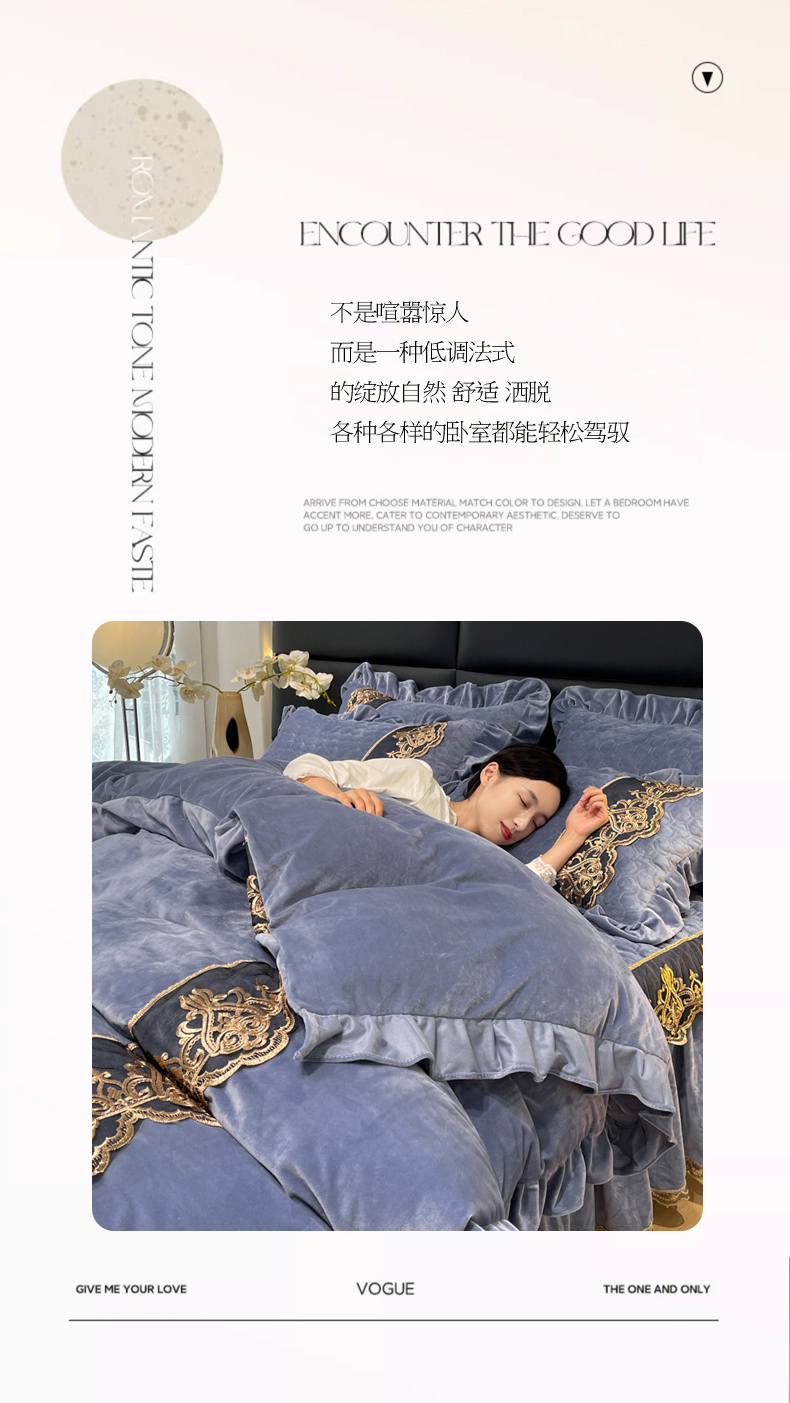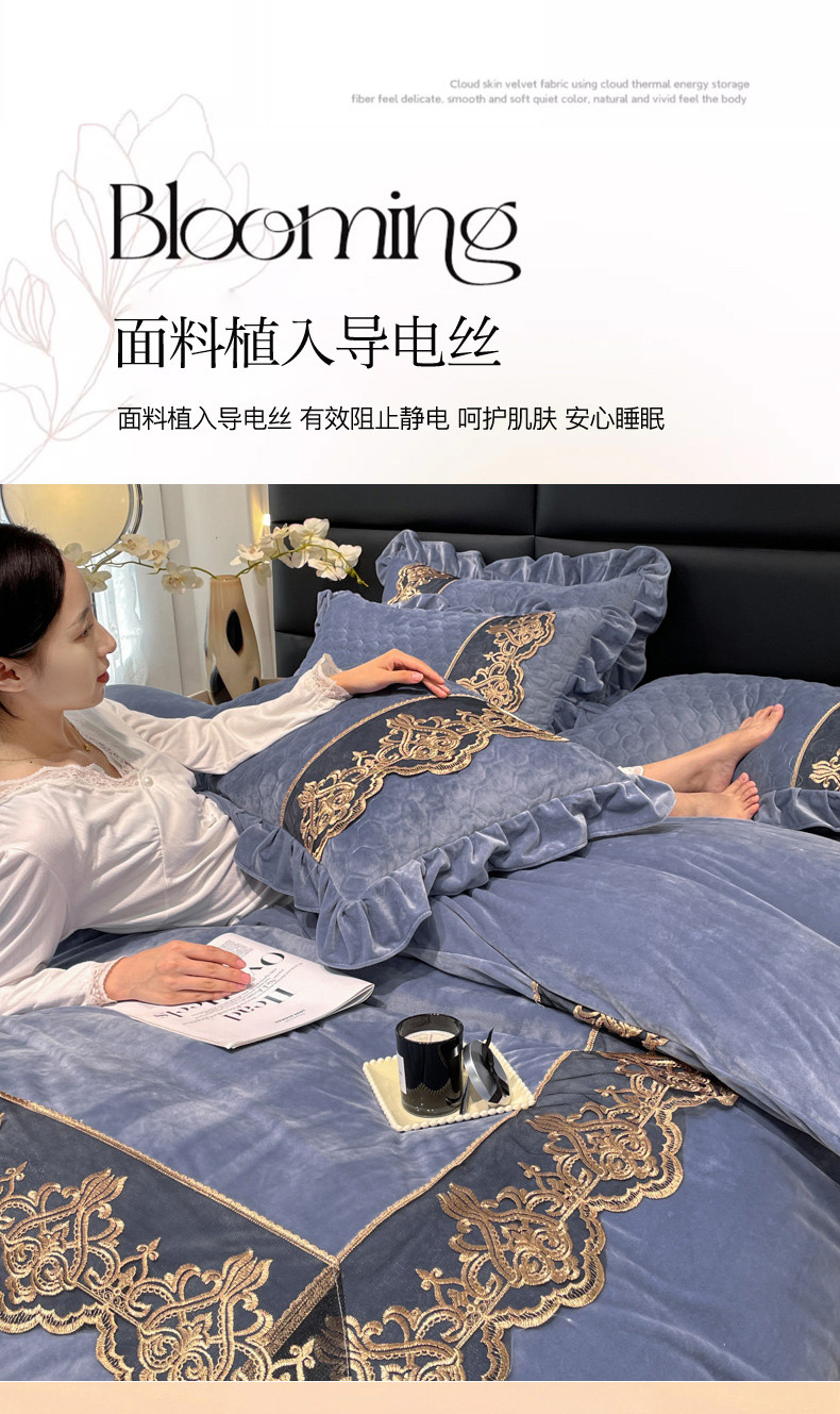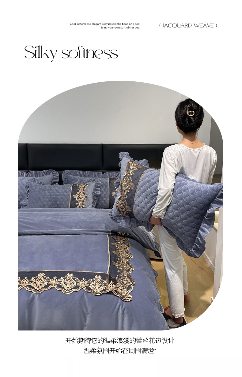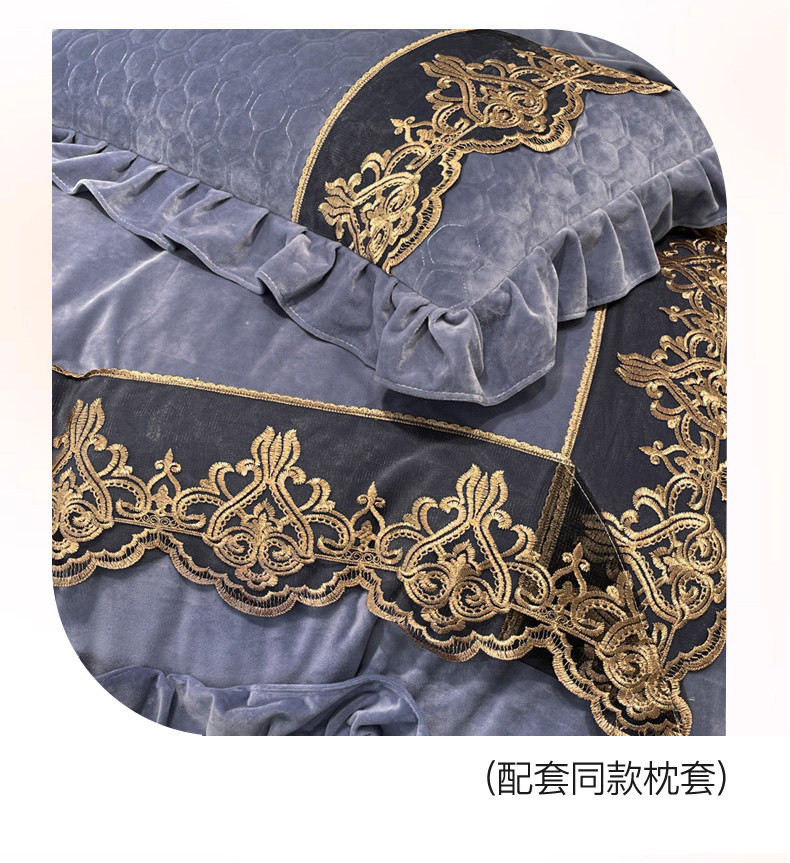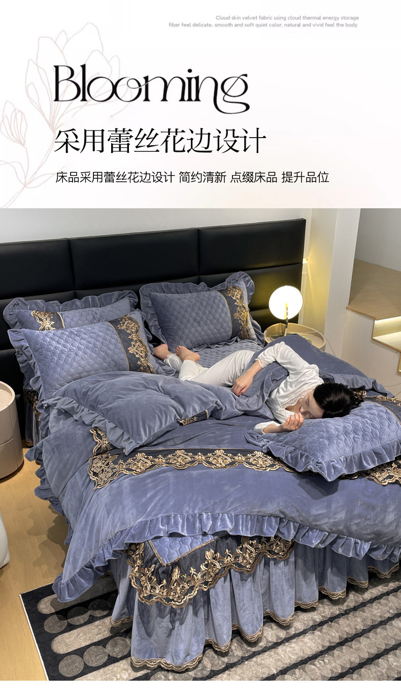 当前位置: 91家纺网 > 商品网购 > 床品套件 > 四件套 > 宝宝绒四件套 > 晨晨家纺2024新款婴儿绒夹棉欧式蕾丝花边床裙四件套--锦绣佳人 蓝灰