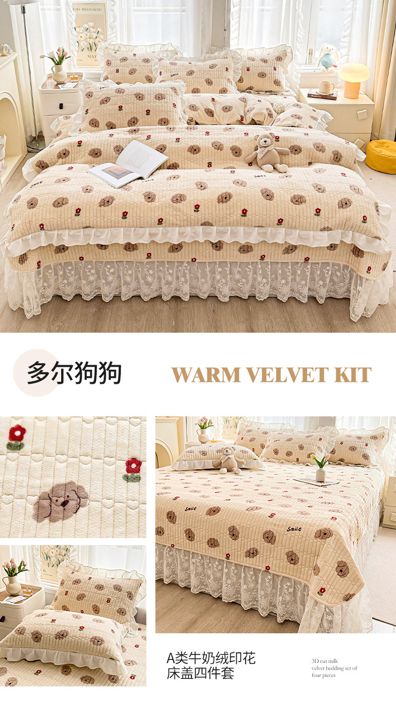 当前位置: 91家纺网 > 商品网购 > 床品套件 > 四件套 > 牛奶绒四件套 > 宜凡家纺 2023新款牛奶绒印花夹棉被套床盖四件套 多尔狗狗