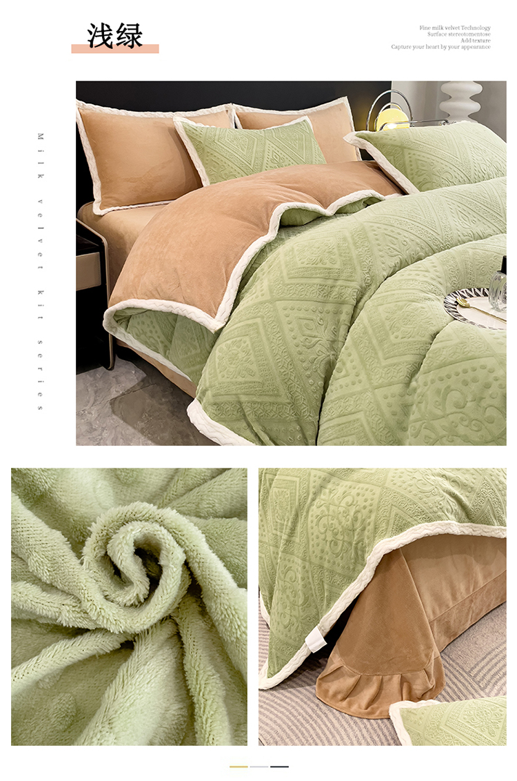 商品名称:金米诺 2024直播爆款轻奢宽边纯色立体雕花牛奶绒四件套 浅绿