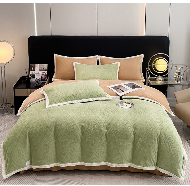 金米诺 2024直播爆款轻奢宽边纯色立体雕花牛奶绒四件套 浅绿