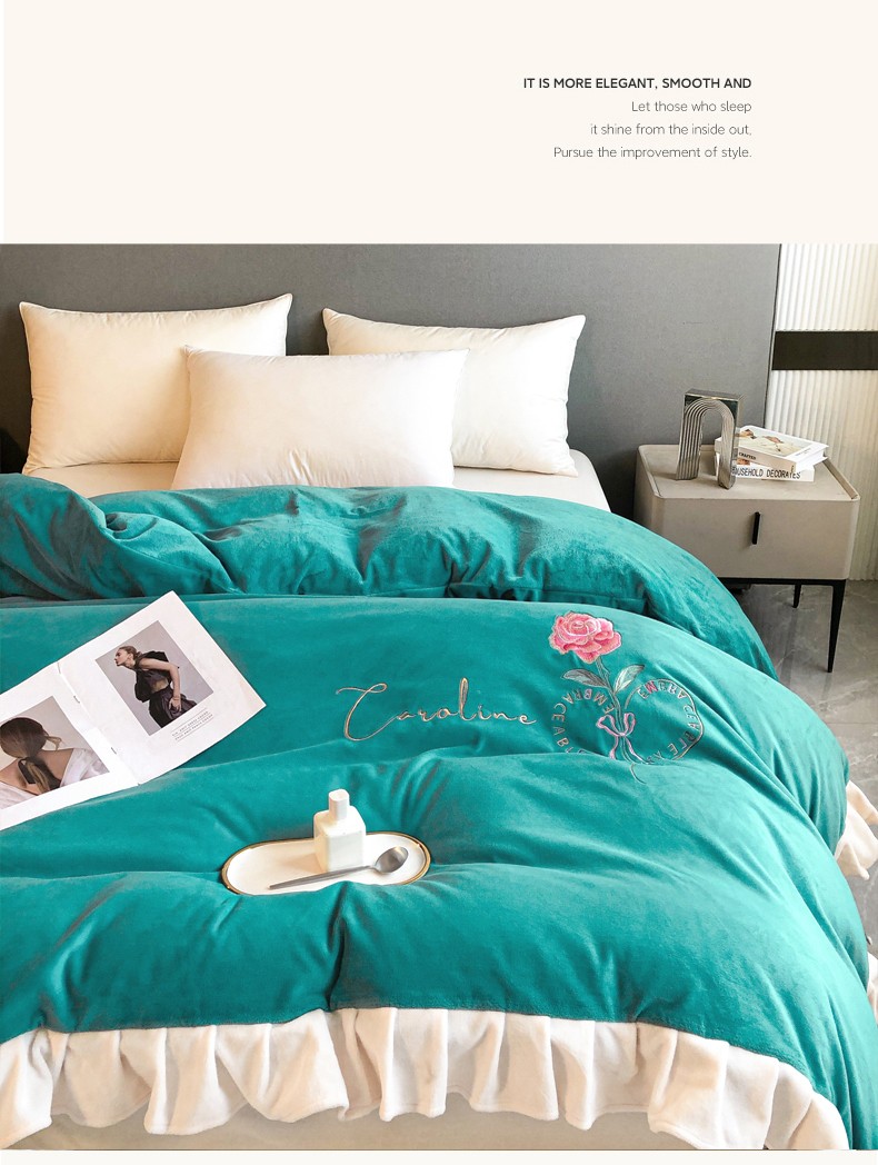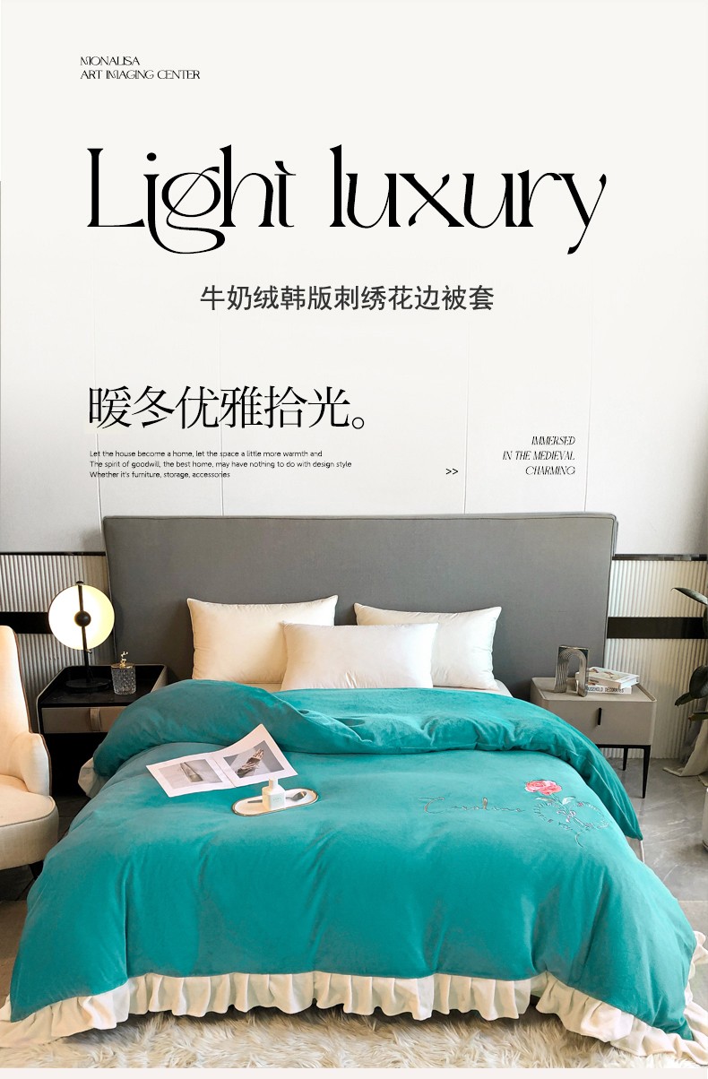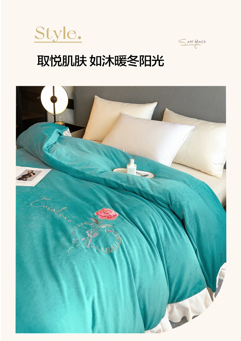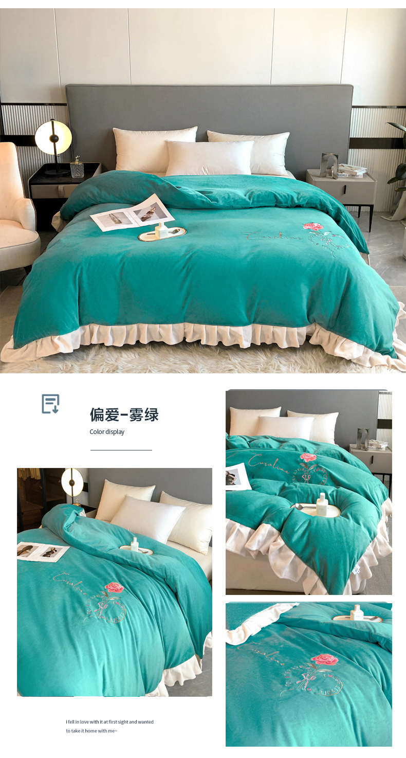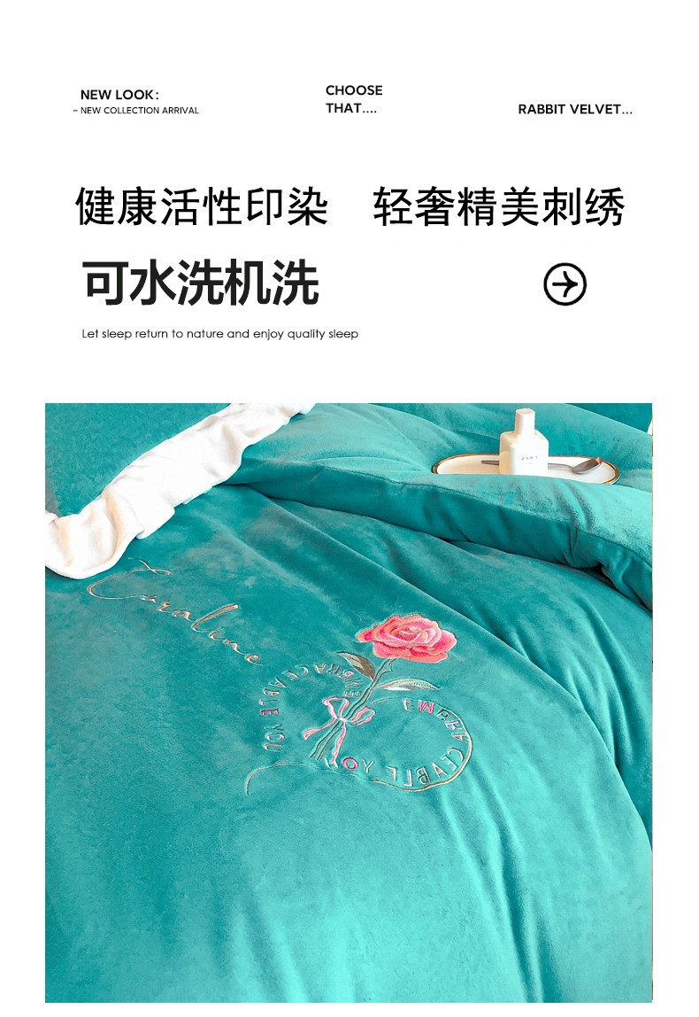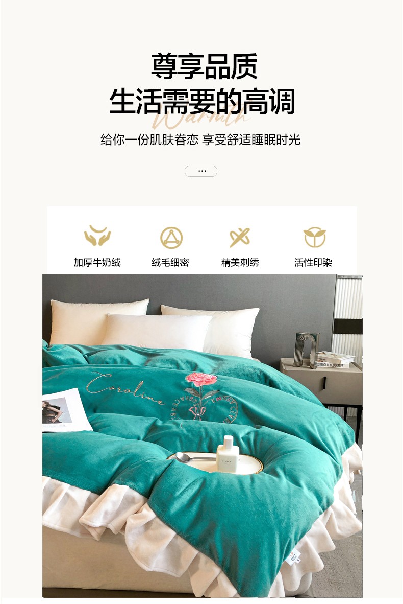 商品名称:7v 2023新款牛奶绒韩版花边刺绣被套法兰绒宝宝绒兔绒单被套 偏爱-雾绿