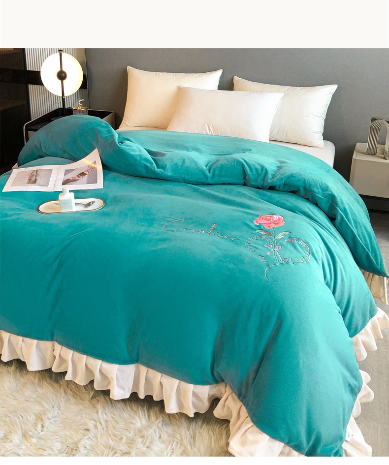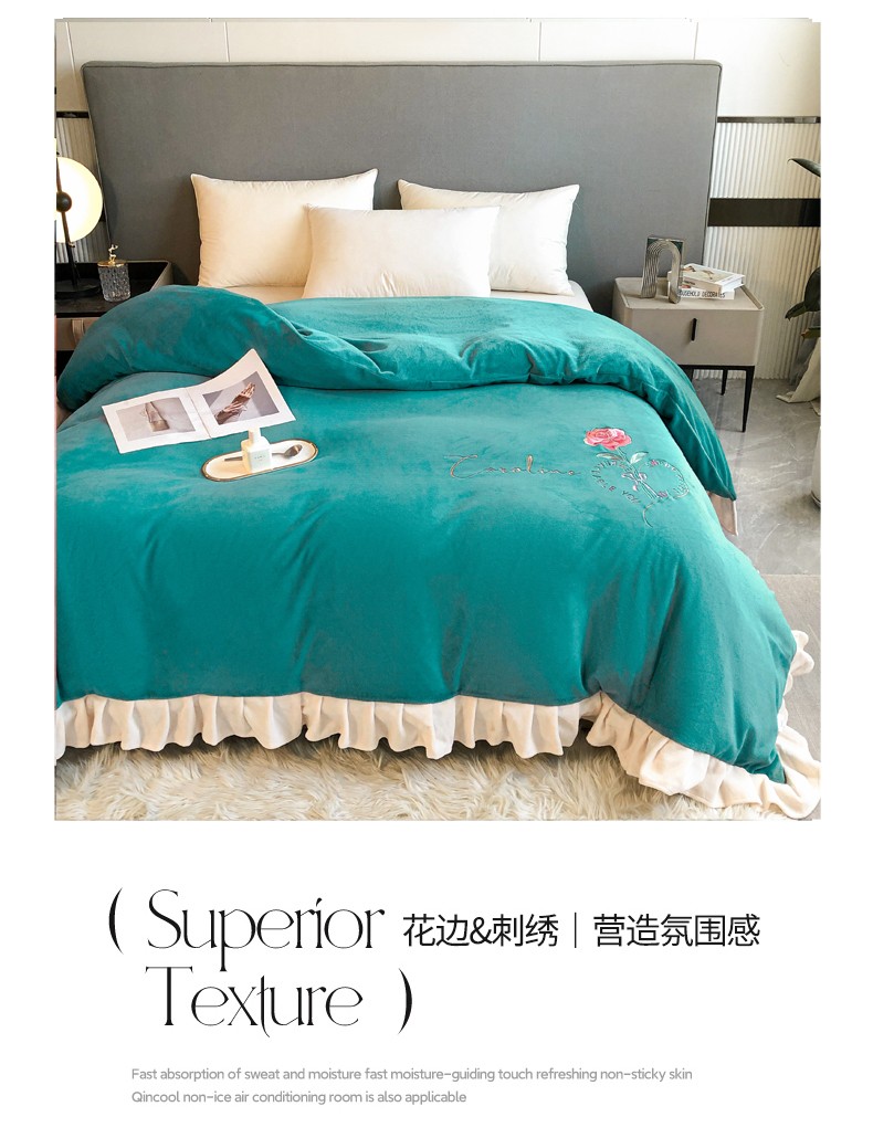 7v 2023新款牛奶绒韩版花边刺绣被套法兰绒宝宝绒兔绒单被套 偏爱-雾绿