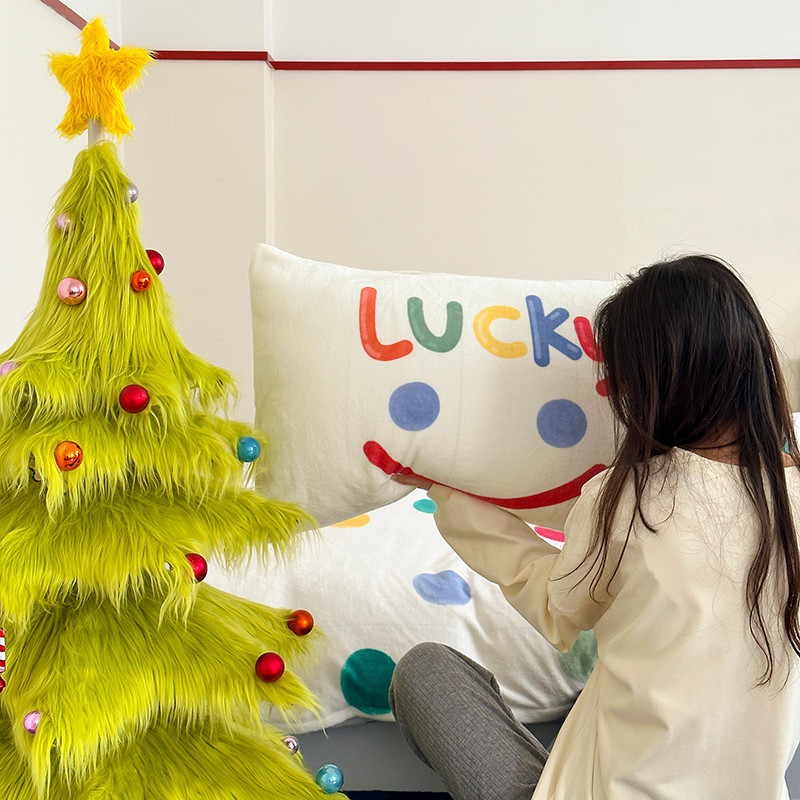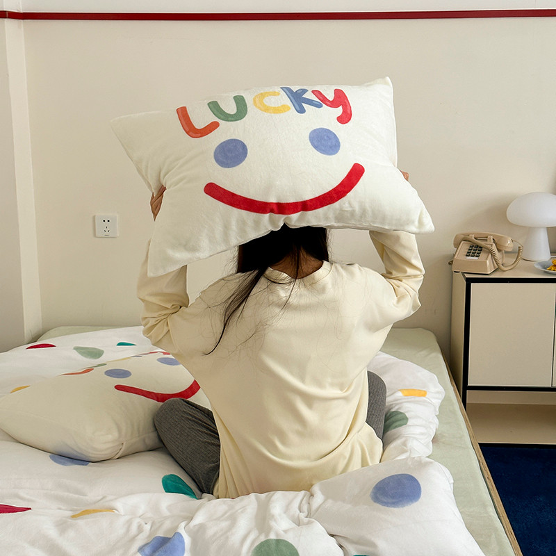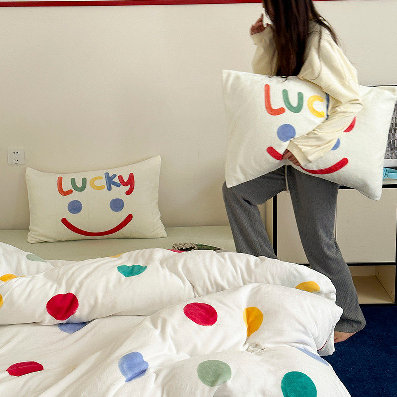 昔可 2023新款大版印花枕套牛奶绒系列四件套-模特图 彩色波点