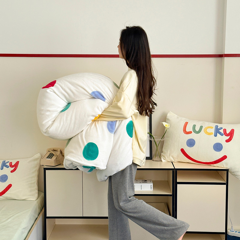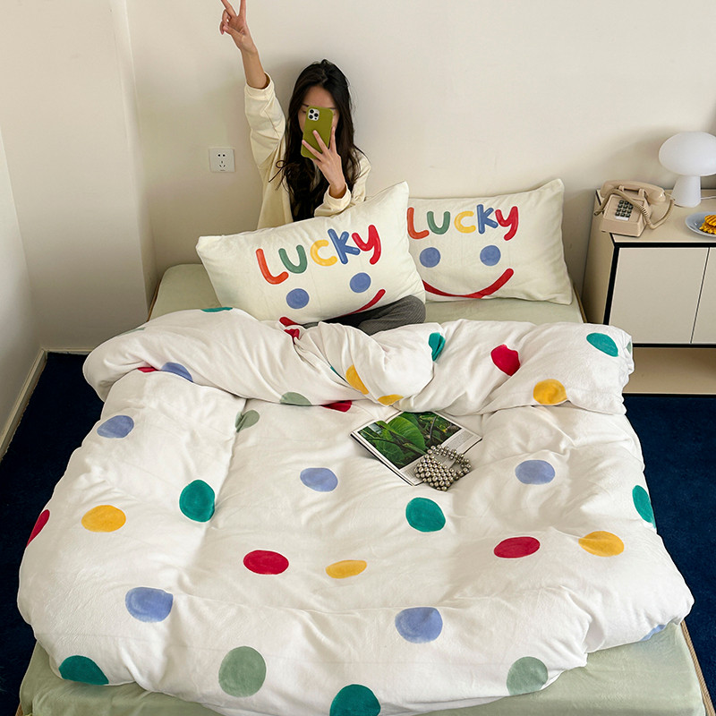 商品名称:昔可 2023新款大版印花枕套牛奶绒系列四件套-模特图 彩色波点