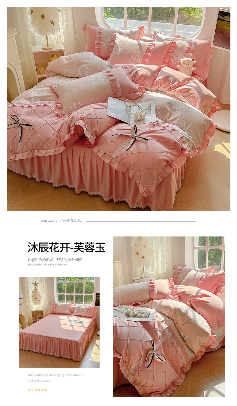 金米诺 2024新款蝴蝶结韩版蕾丝花边床裙四件套 沐辰花开-芙蓉玉