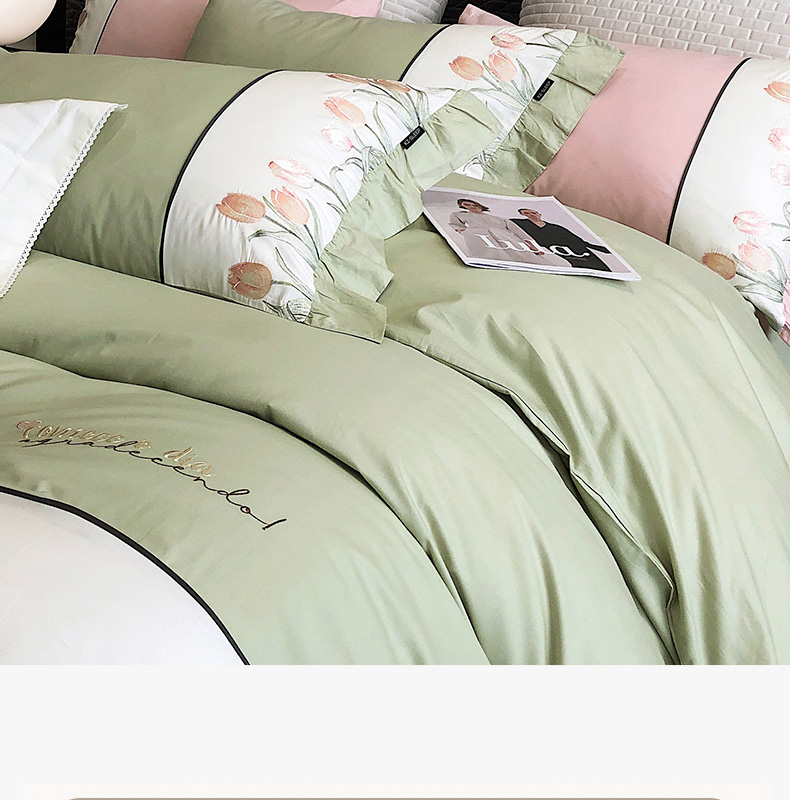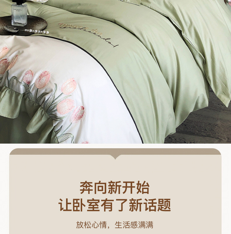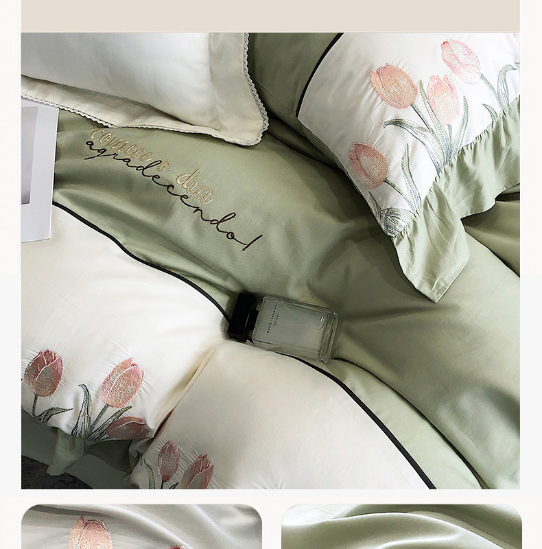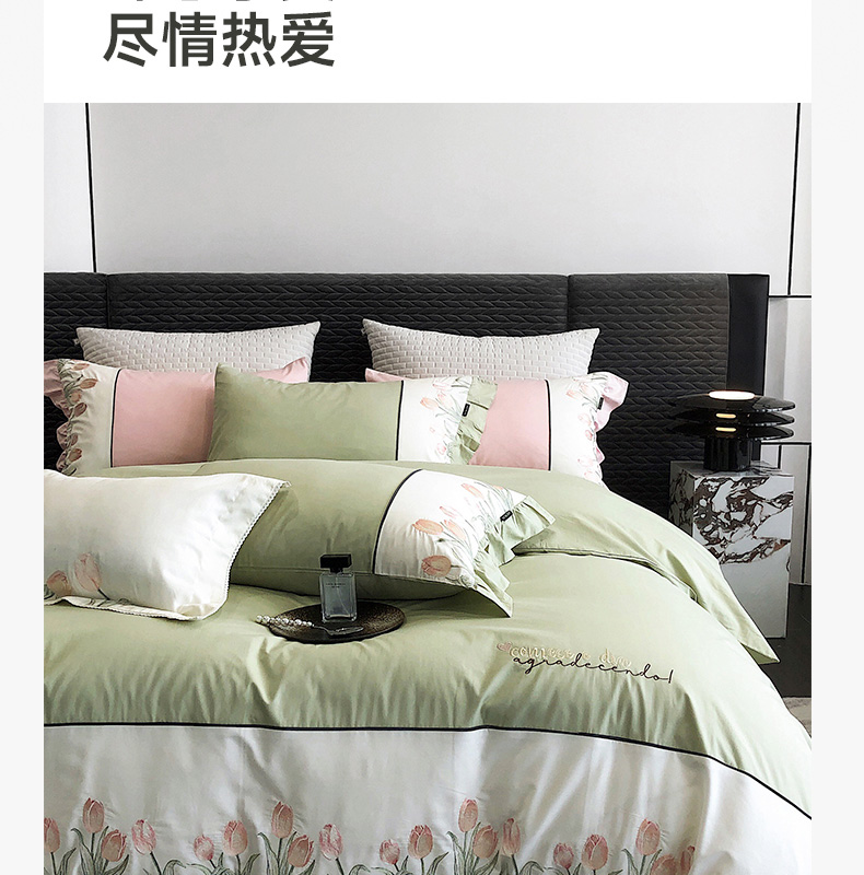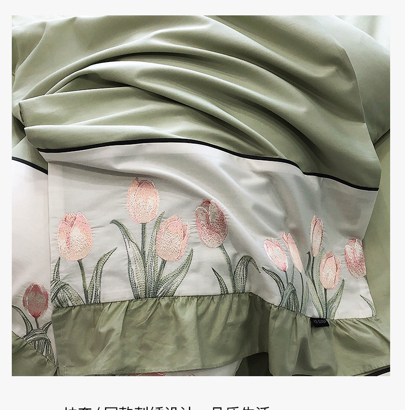 商品名称:卡姿家纺 2024新款秋冬全棉优雅刺绣四件套—粉色郁金香 粉色郁金香-豆绿