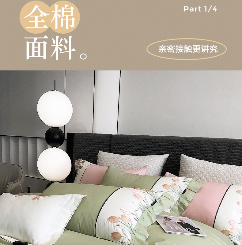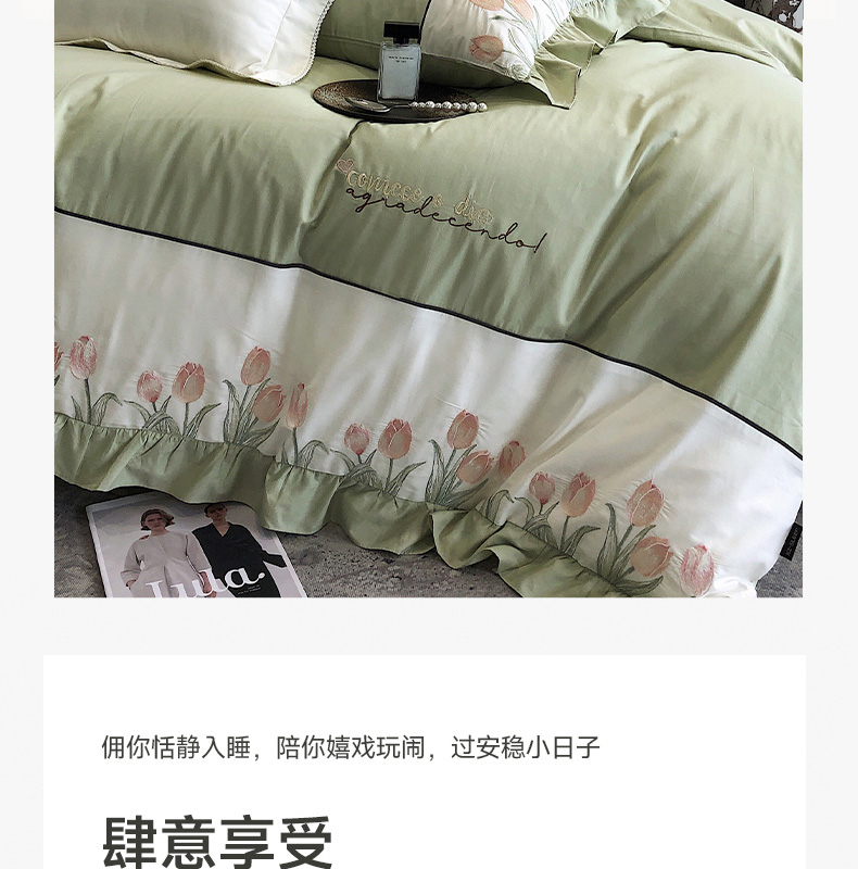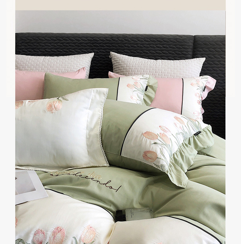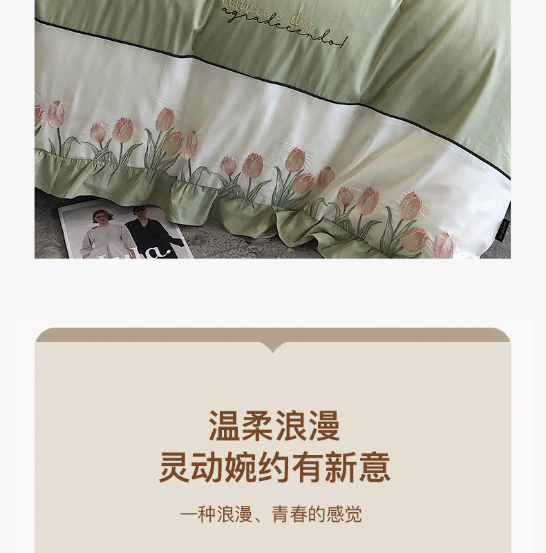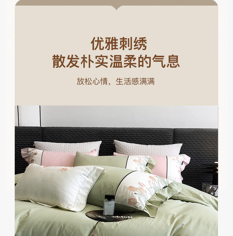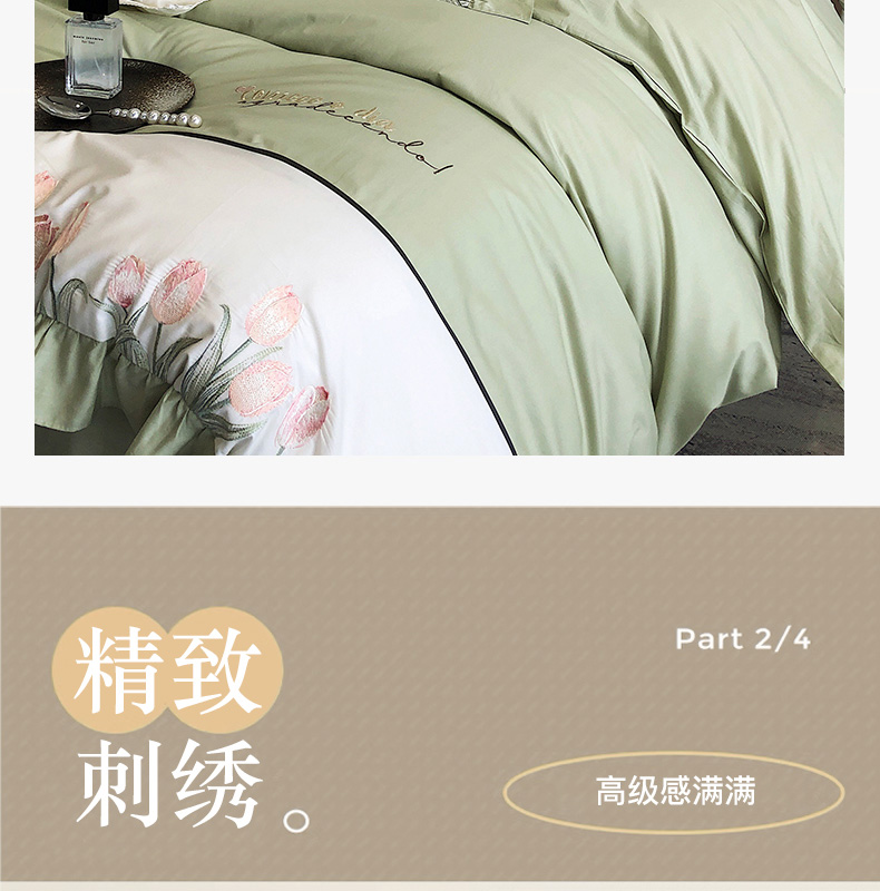 商品名称:卡姿家纺 2024新款秋冬全棉优雅刺绣四件套—粉色郁金香 粉色郁金香-豆绿