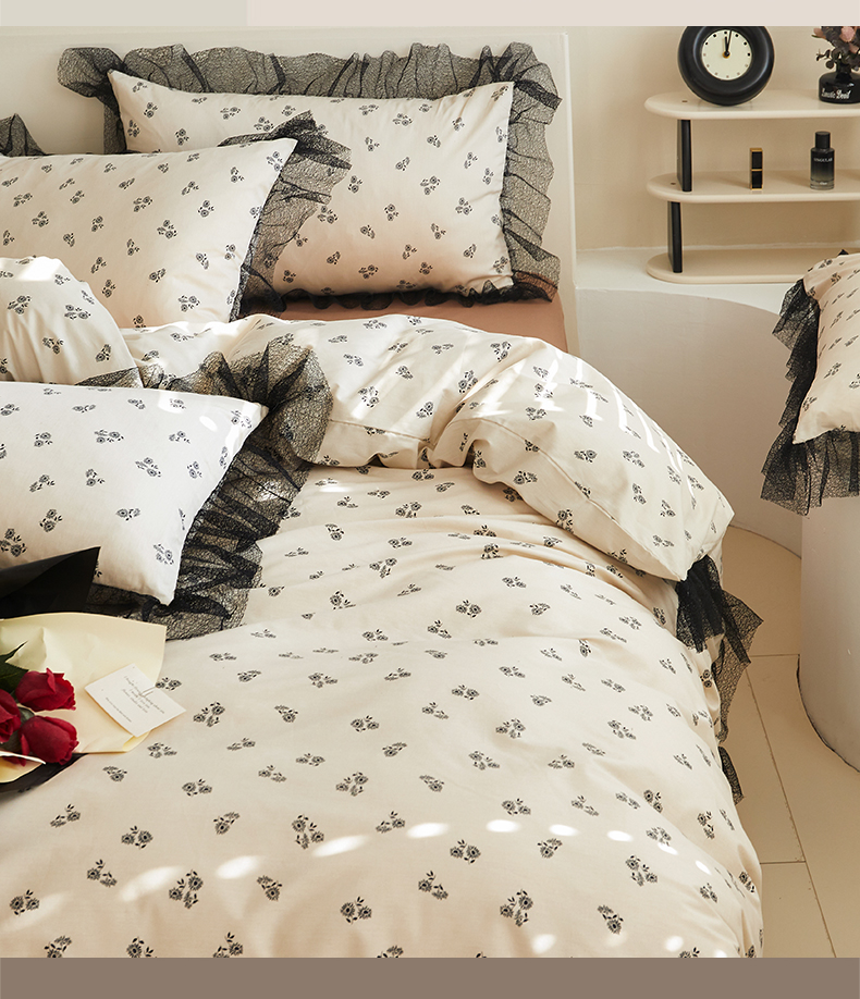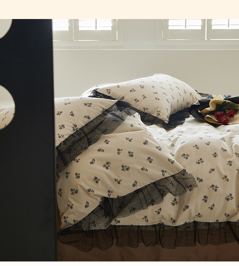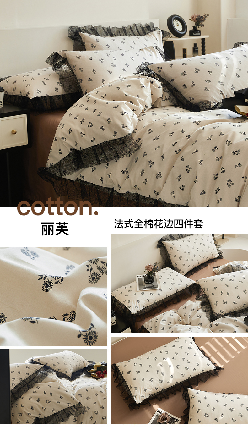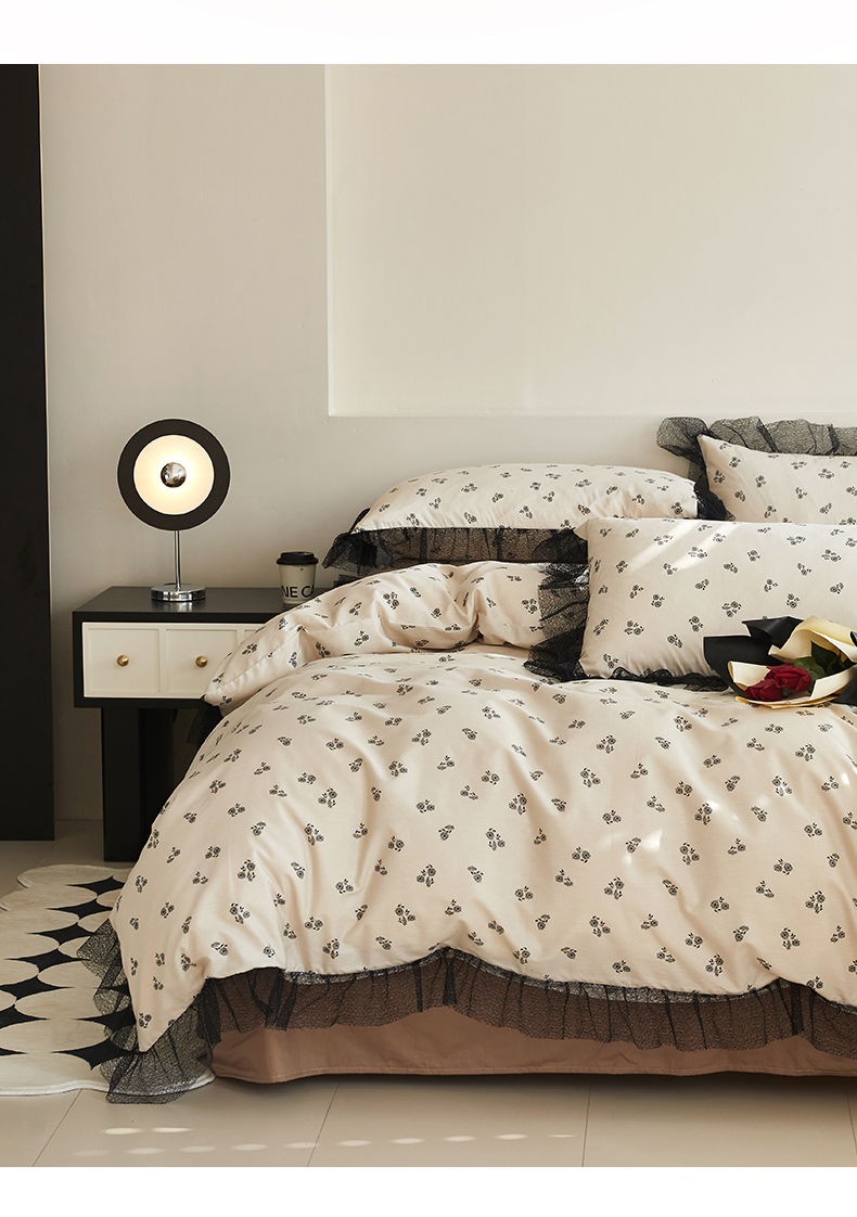 绫韵家纺 2024新款春夏新品全棉复法式黑色镂空花边小碎花纯棉三四件套 丽芙