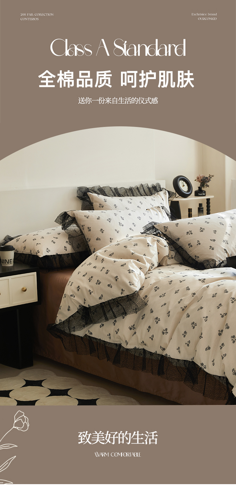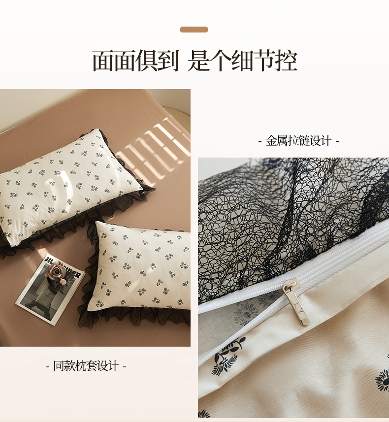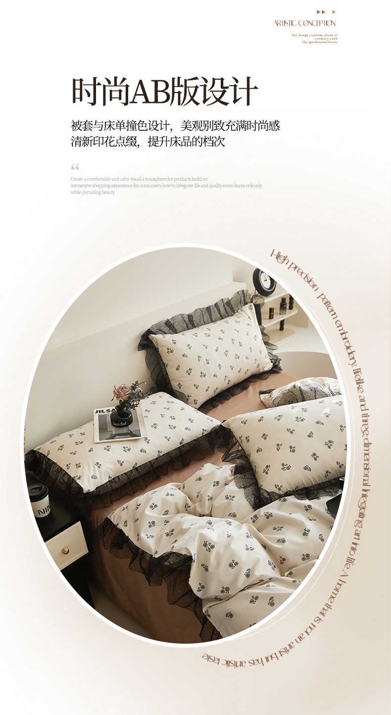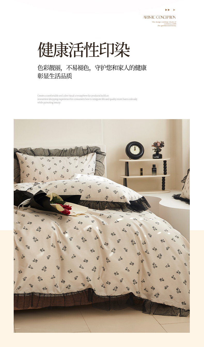 绫韵家纺 2024新款春夏新品全棉复法式黑色镂空花边小碎花纯棉三四件套 丽芙