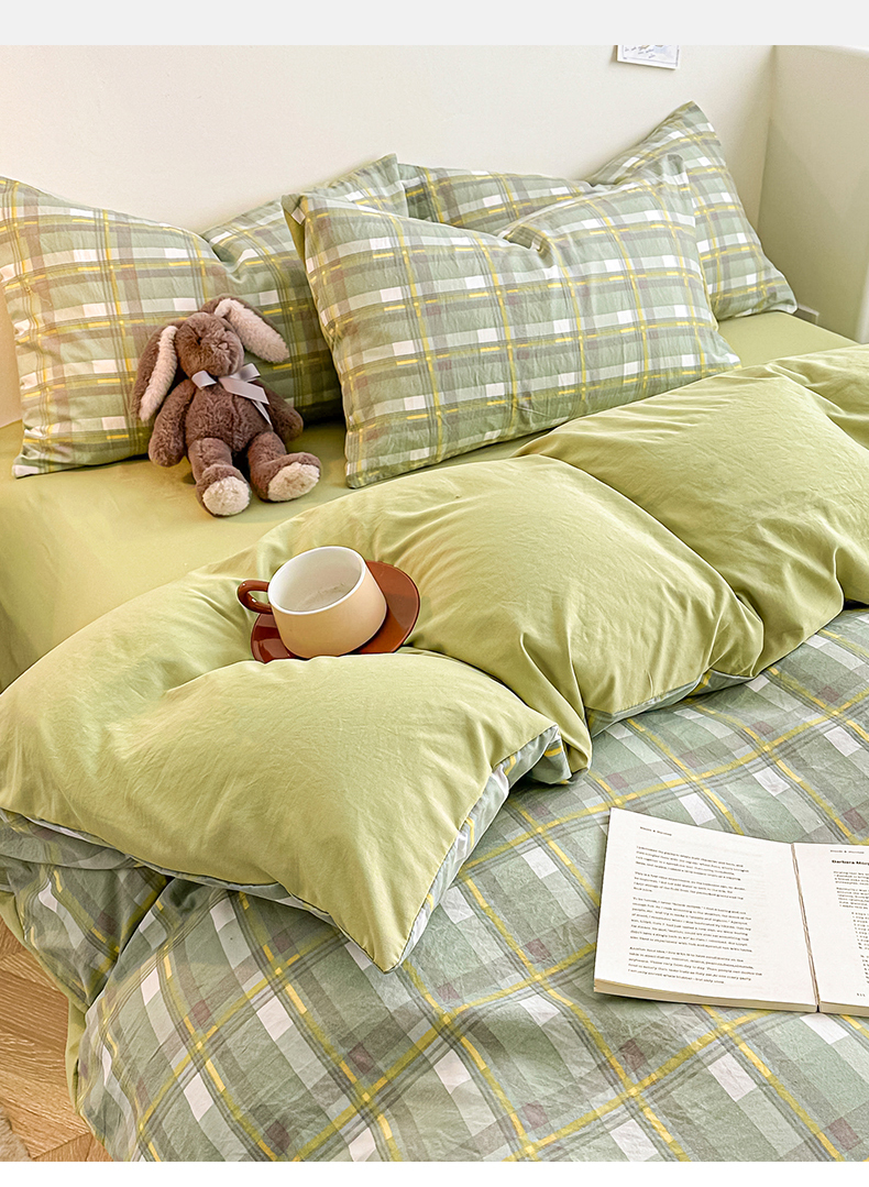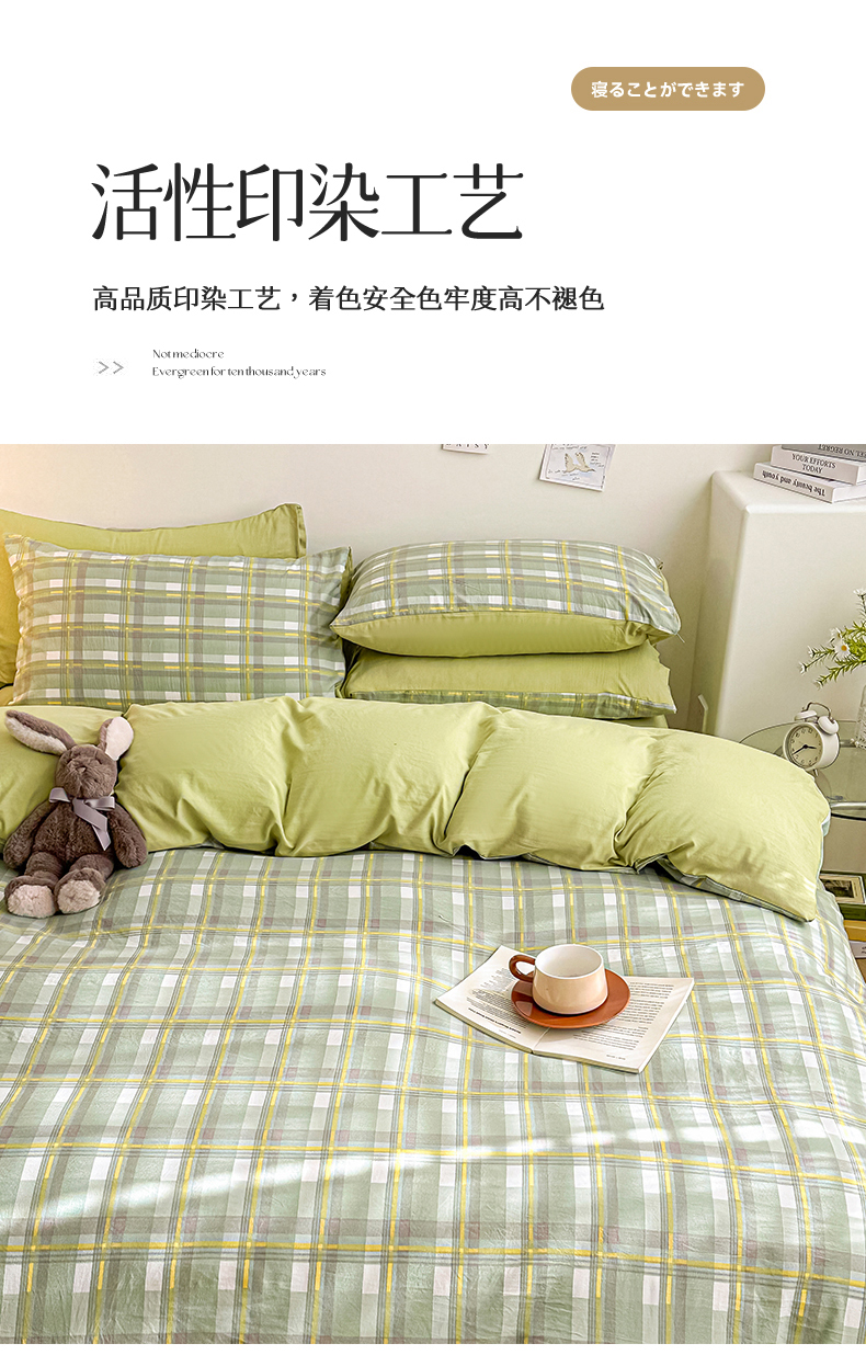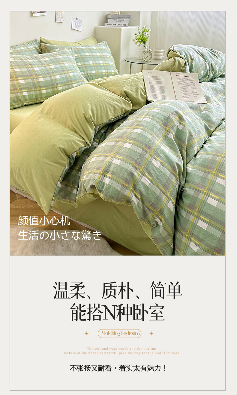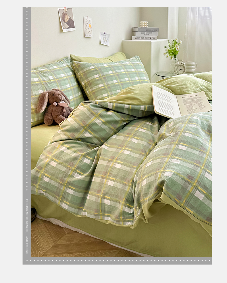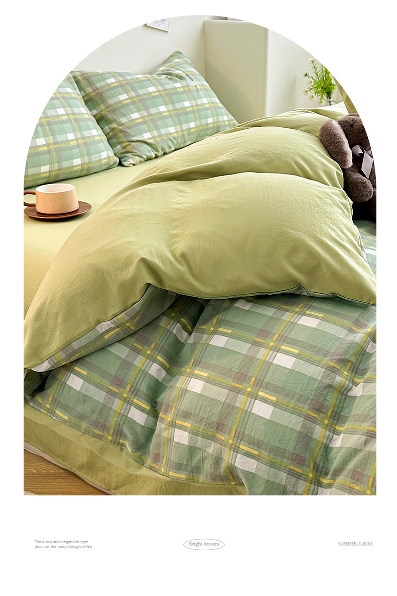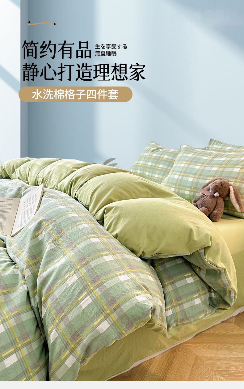 当前位置: 91家纺网 > 商品网购 > 床品套件 > 四件套 > 水洗棉四件套 > 古吉梦 2024新款水洗棉小清新印花格子系列四件套 G简兮-绿+果绿