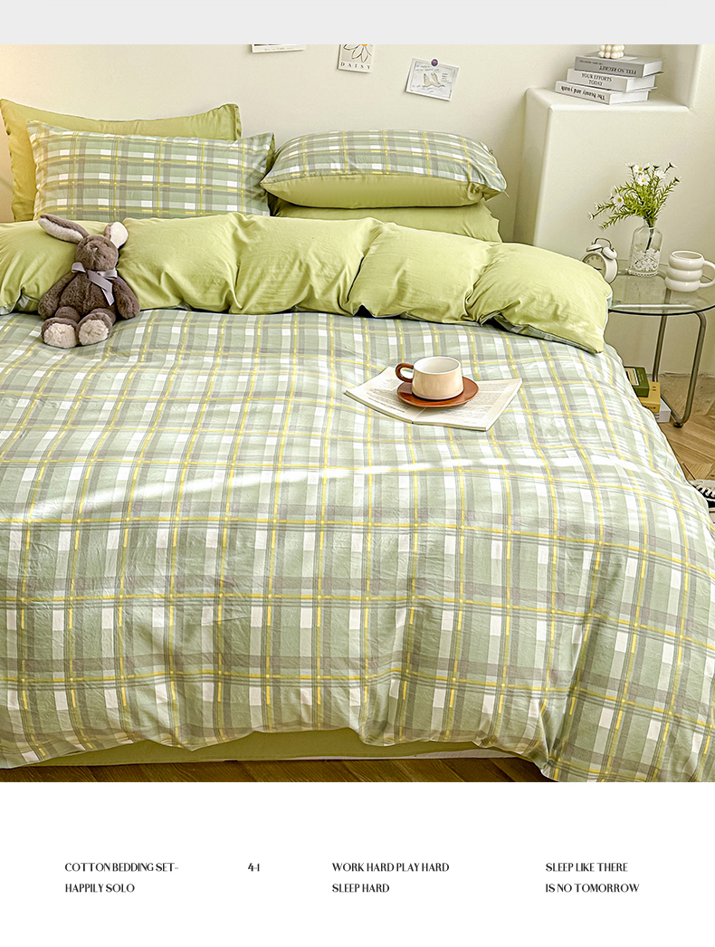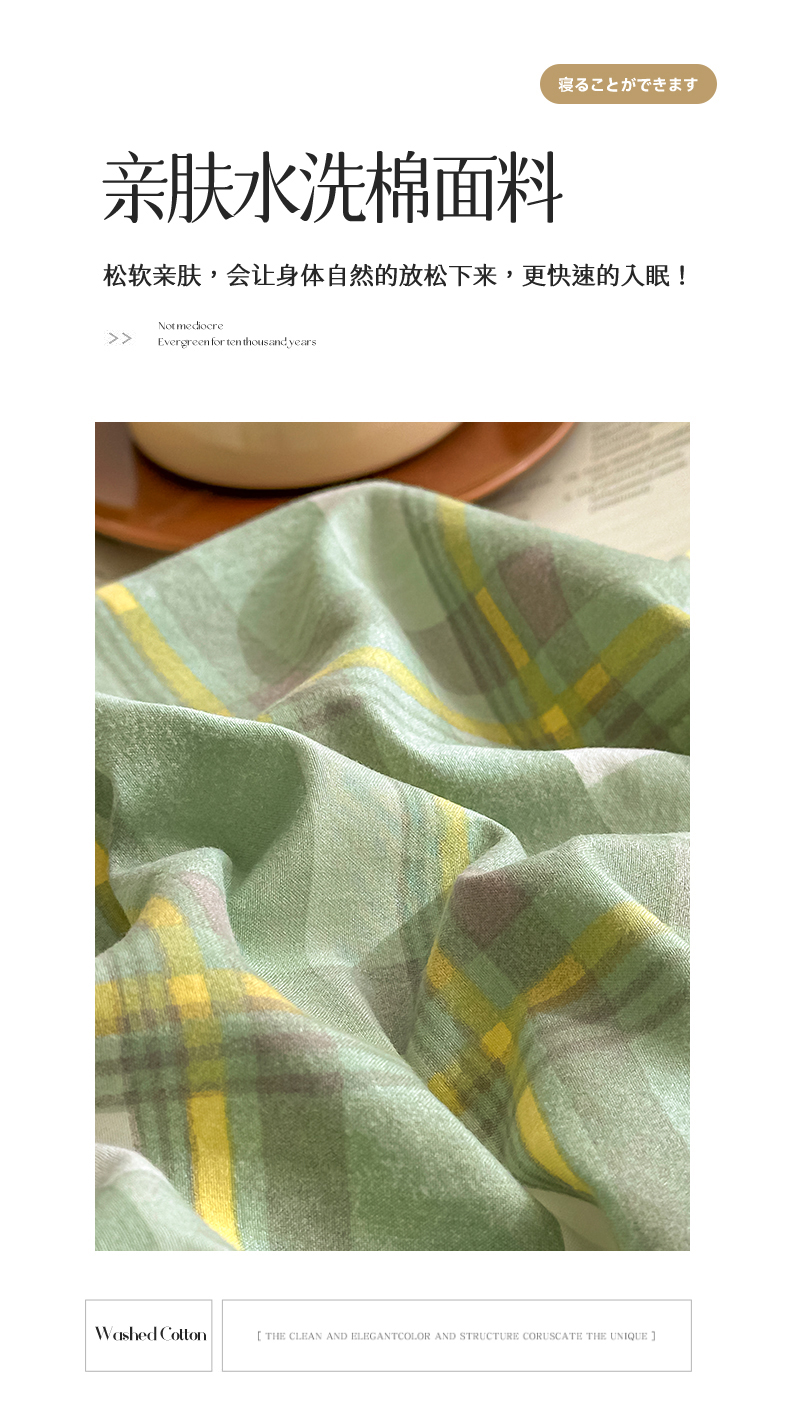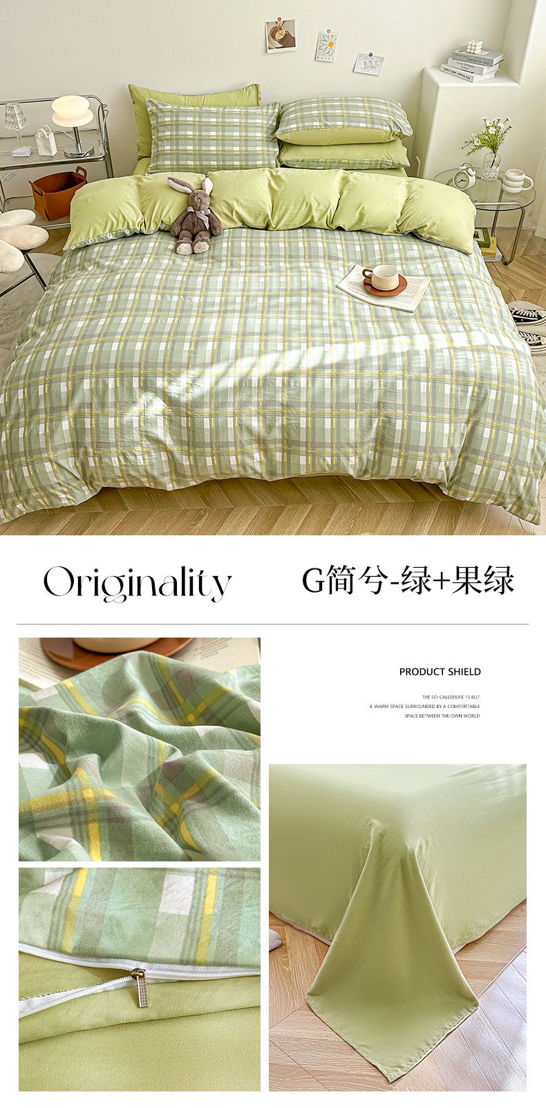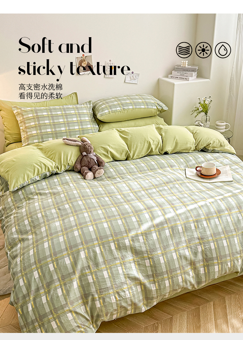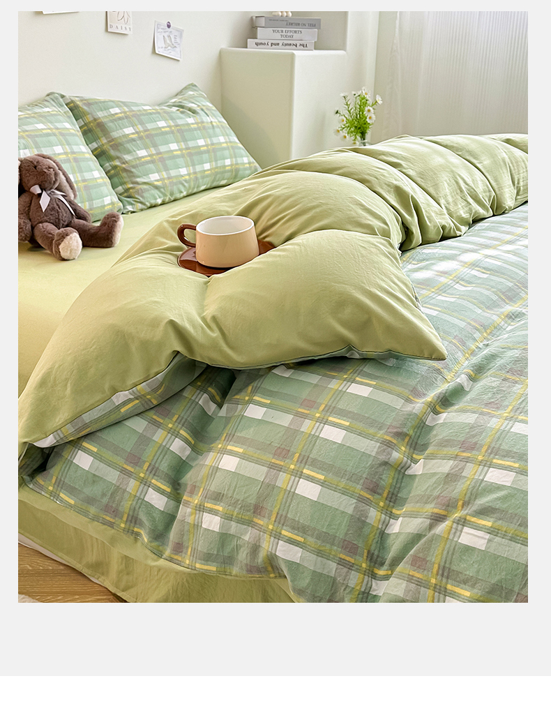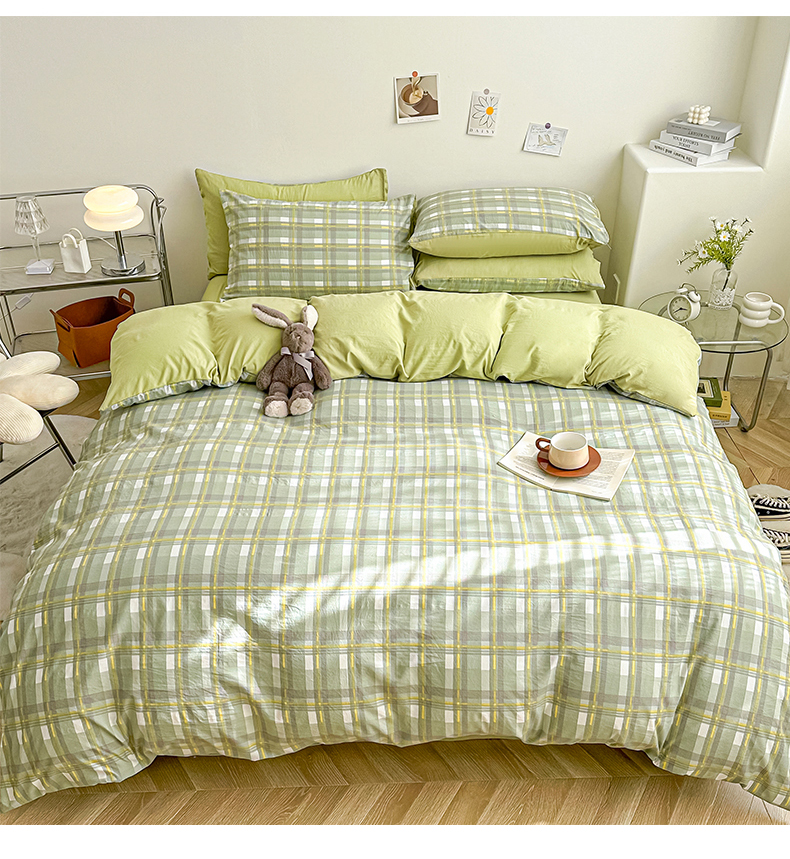 当前位置: 91家纺网 > 商品网购 > 床品套件 > 四件套 > 水洗棉四件套 > 古吉梦 2024新款水洗棉小清新印花格子系列四件套 G简兮-绿+果绿