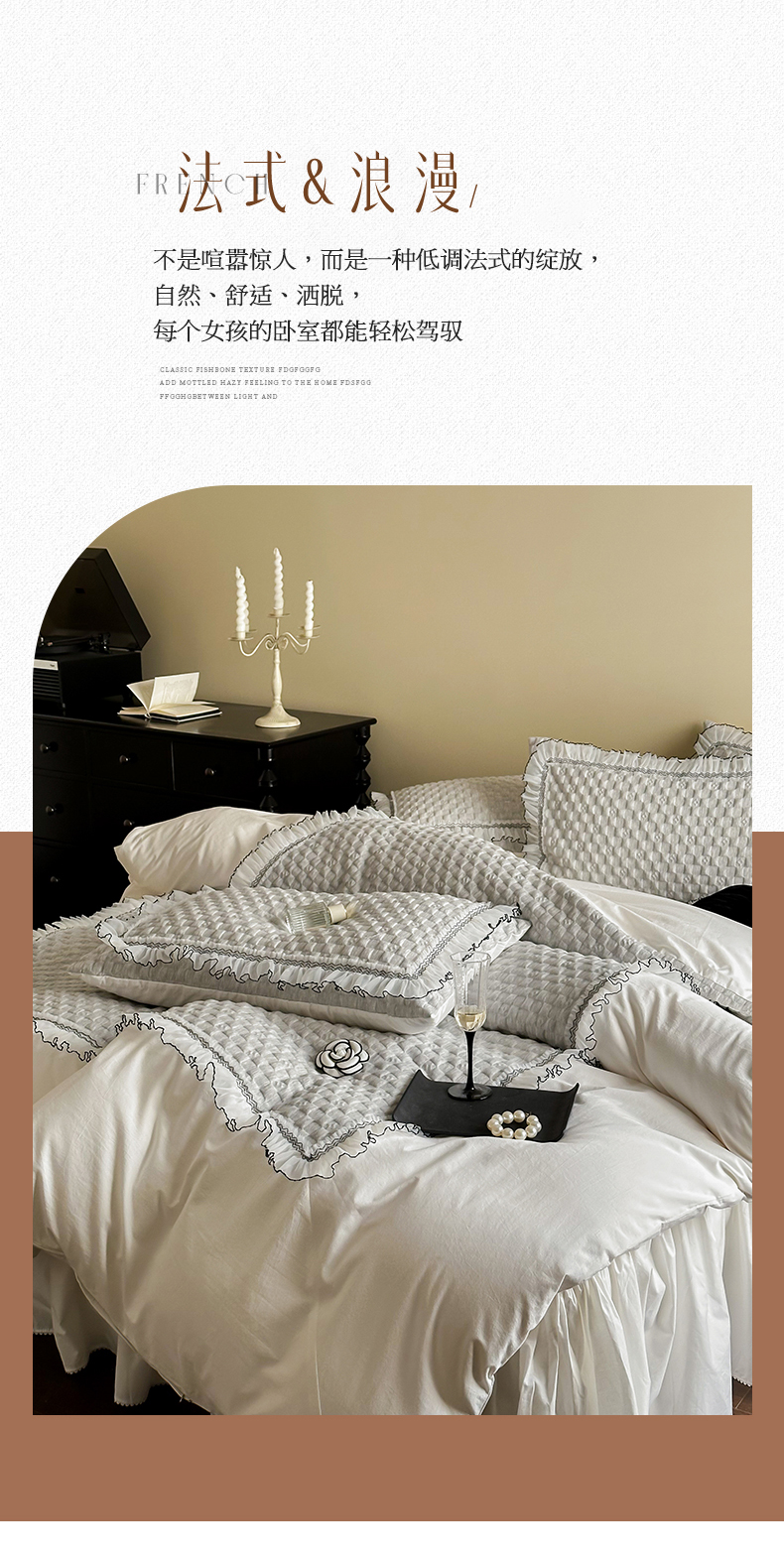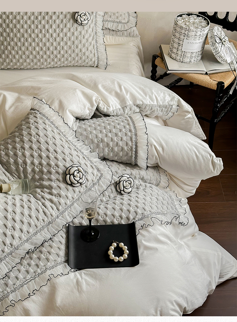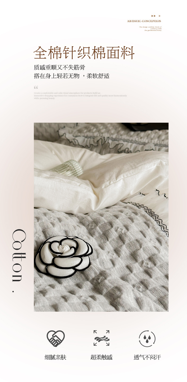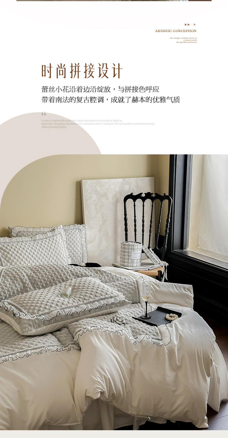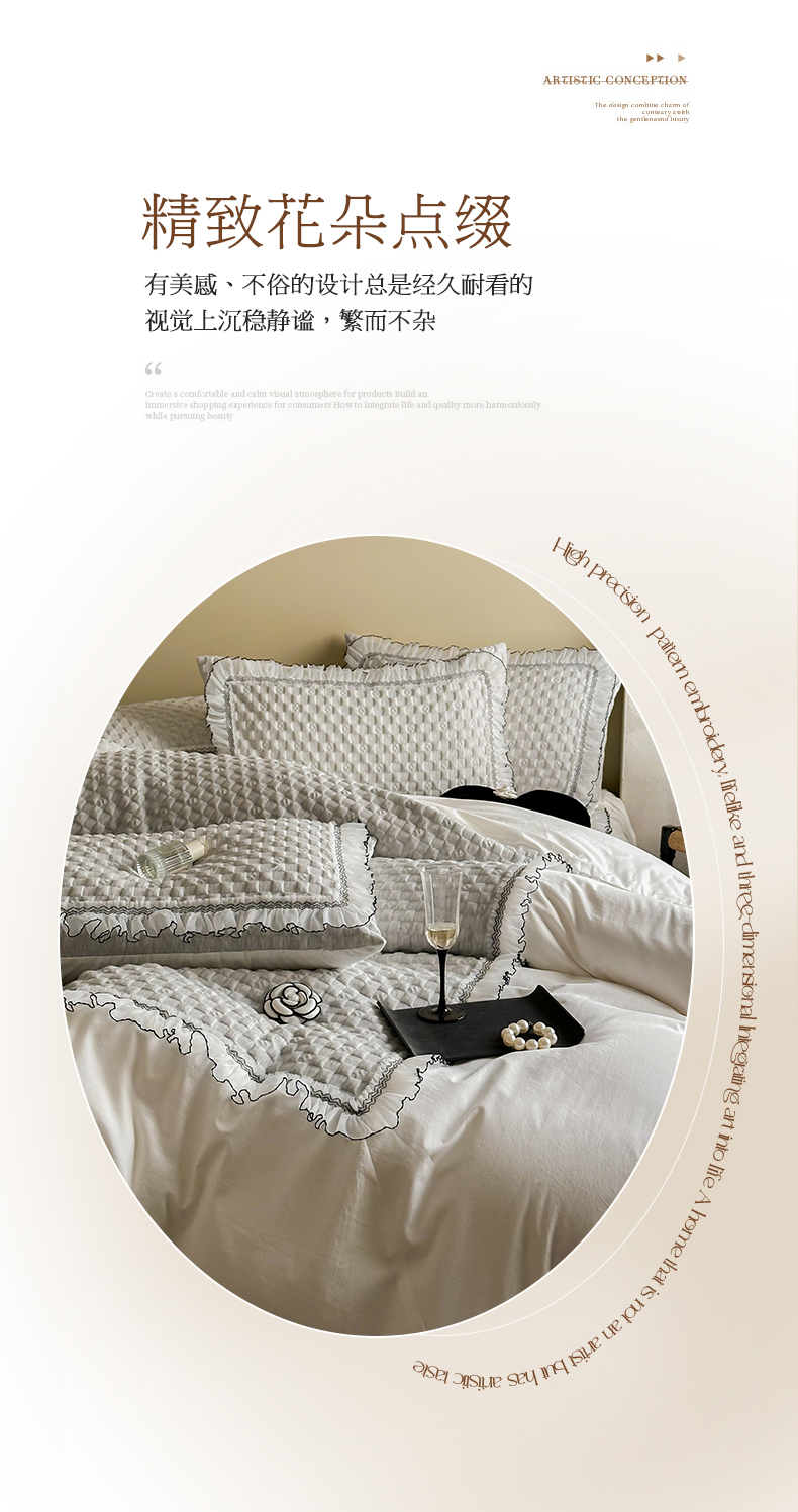 当前位置: 91家纺网 > 商品网购 > 床品套件 > 四件套 > 全棉普通四件套 > 婳庭家居 2024新款法式全棉水洗针织新疆棉四件套-米娜系列 米娜-奶灰