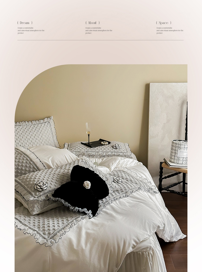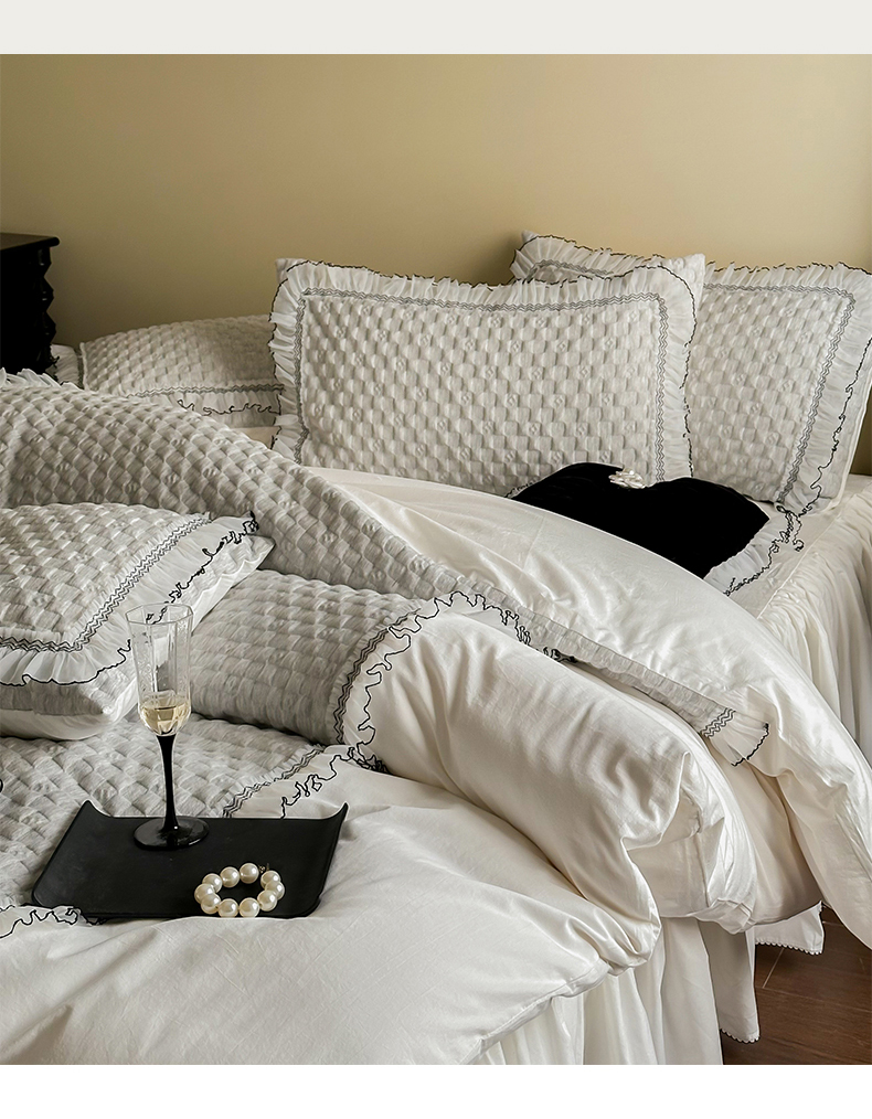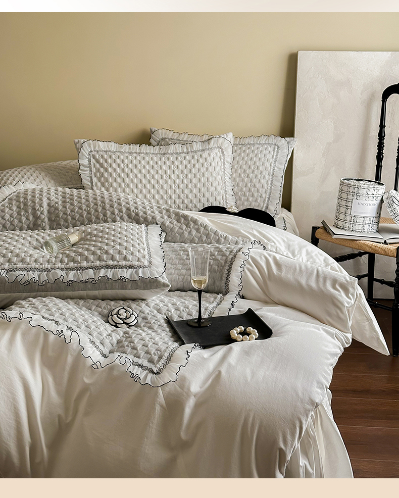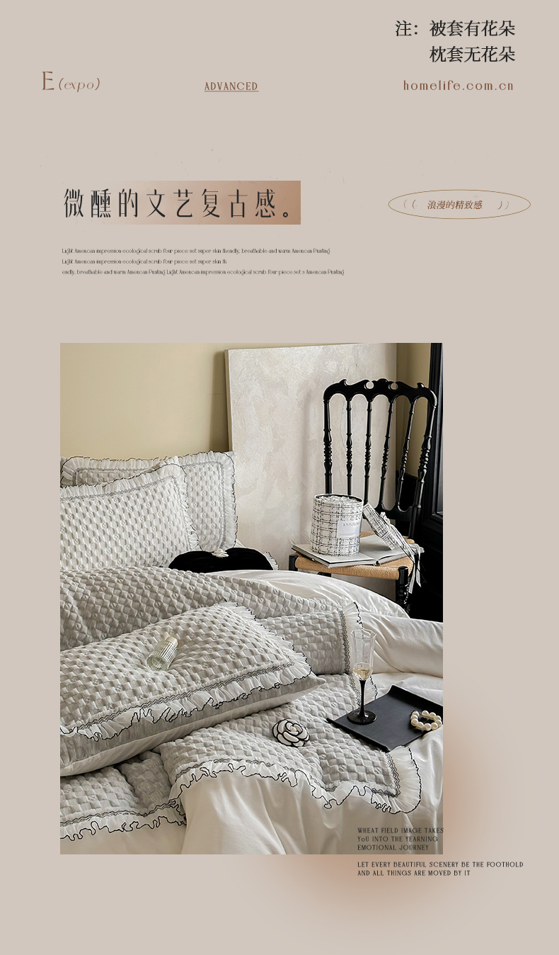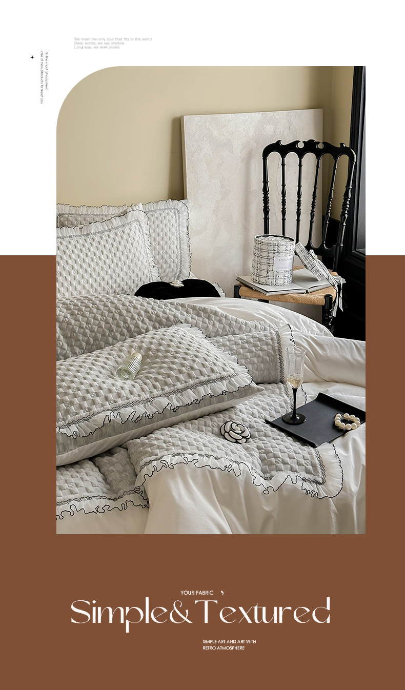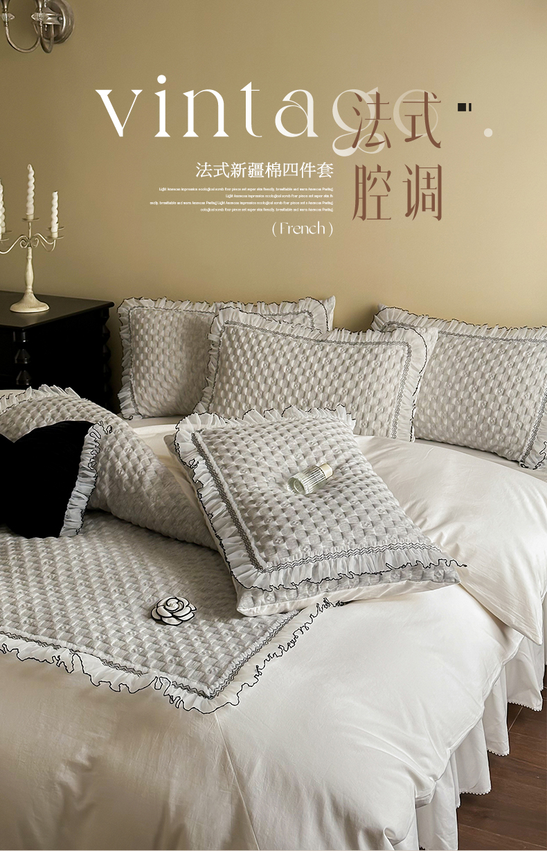 当前位置: 91家纺网 > 商品网购 > 床品套件 > 四件套 > 全棉普通四件套 > 婳庭家居 2024新款法式全棉水洗针织新疆棉四件套-米娜系列 米娜-奶灰