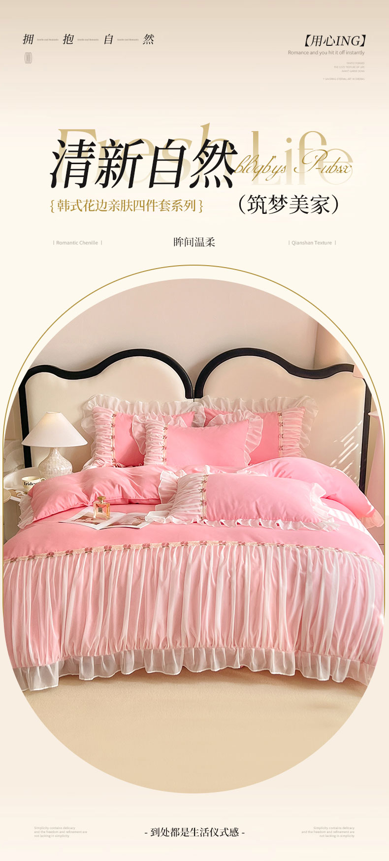 (总)芭比蔓 2024新款直播供货韩版花边款牛奶绒四件套,爱玛橙,宝石红,湖蓝,倾国粉,秋月黄,深灰,珍珠白,竹青绿