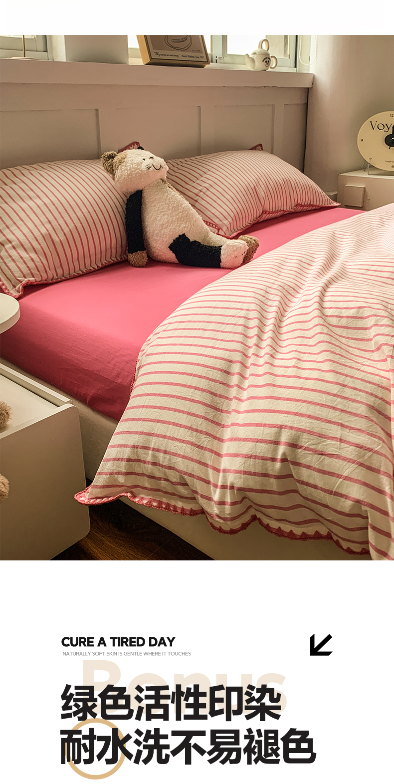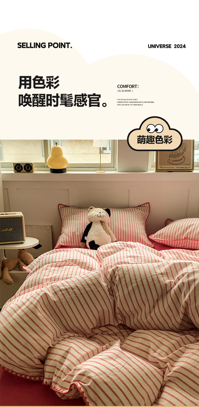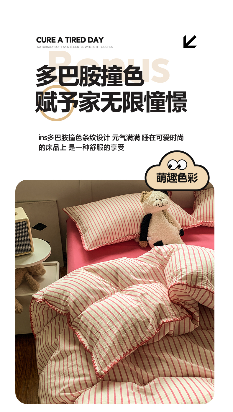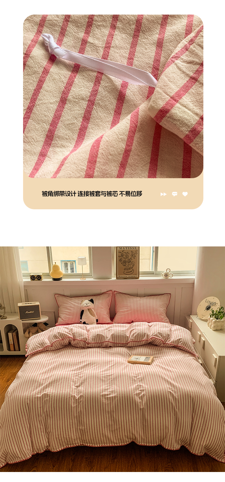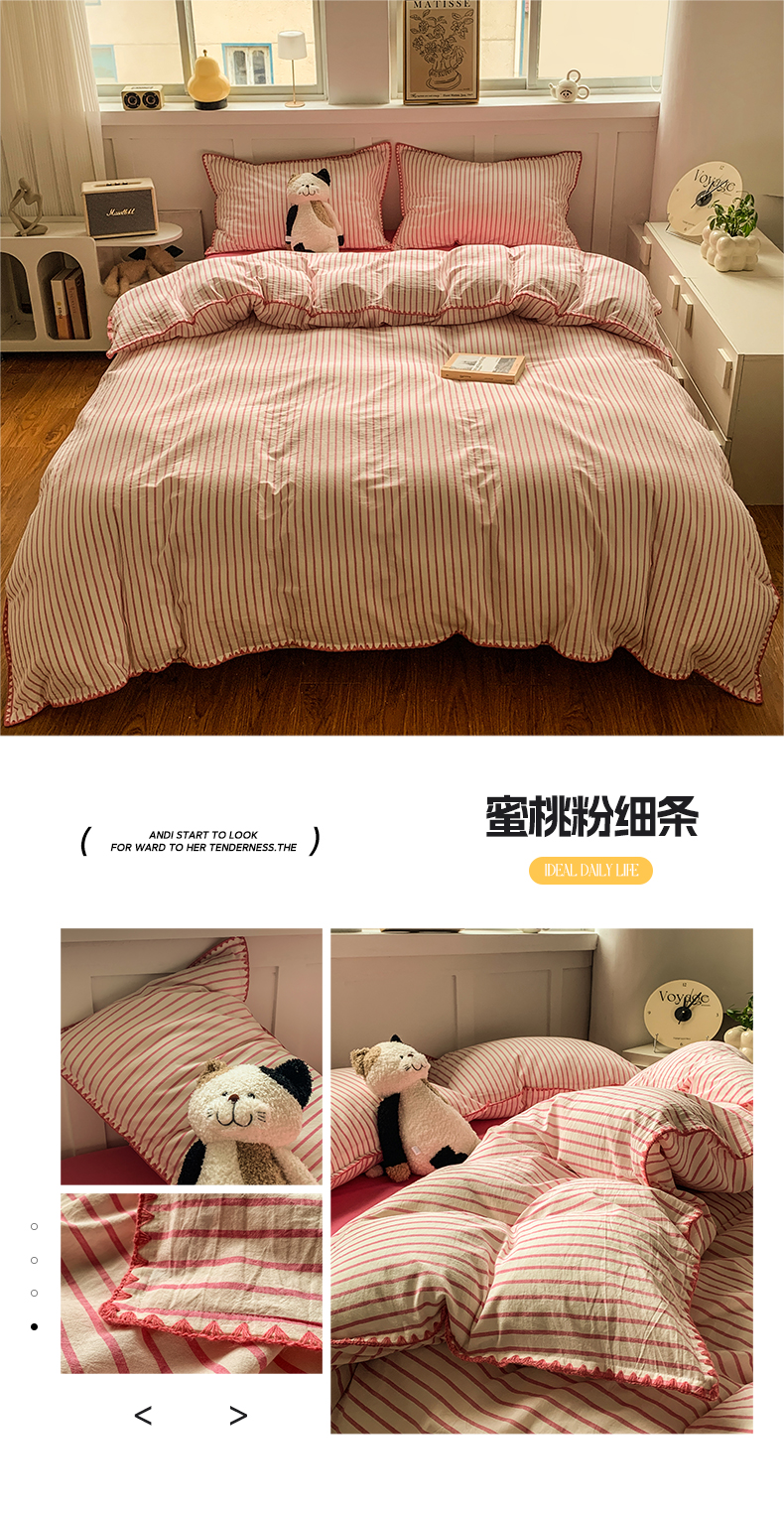 当前位置: 91家纺网 > 商品网购 > 床品套件 > 四件套 > 全棉普通四件套 > 莱茵家居 2024新款A类多巴胺撞色全棉水洗棉四件套 蜜桃粉细条
