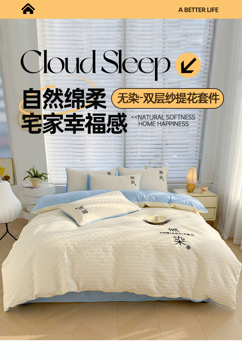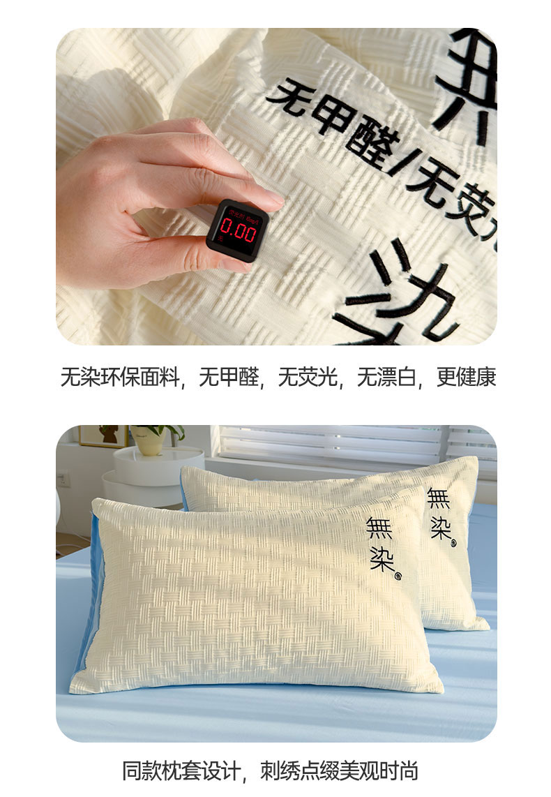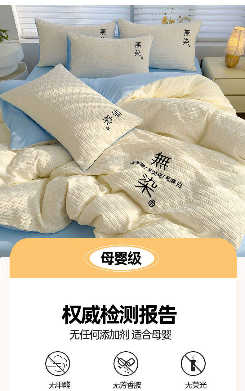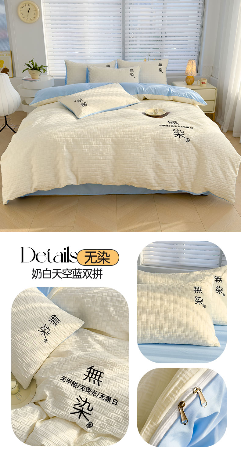 当前位置: 91家纺网 > 商品网购 > 床品套件 > 四件套 > 提花四件套 > 灰鲸 2025新款A类双层纱无染提花四件套 无染-奶白天空蓝双拼