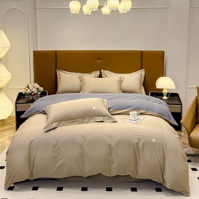 U品汇 2024新品60S支贡缎长绒棉刺绣花四件套AB版纯棉全棉4件套100%棉 爱莎-浅驼