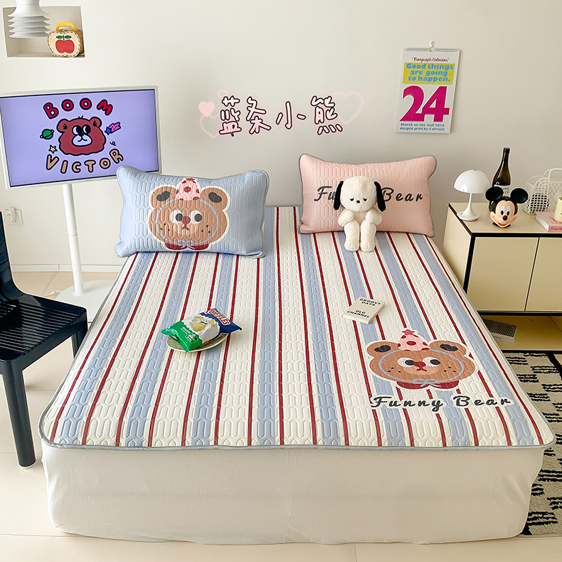 顾里家纺 顾里家纺 2024新款凉感丝数码印花INS风大版凉席三件套 蓝条小熊