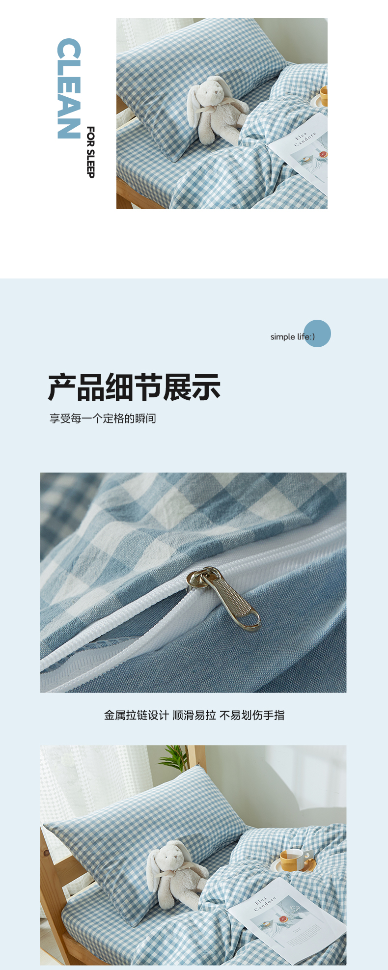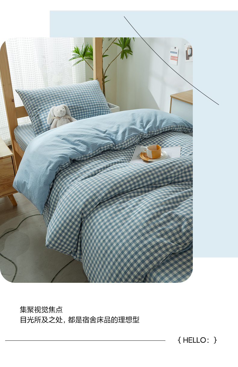 商品名称:九沐良品 新款A类全棉水洗棉宿舍三件套 浅蓝小格
