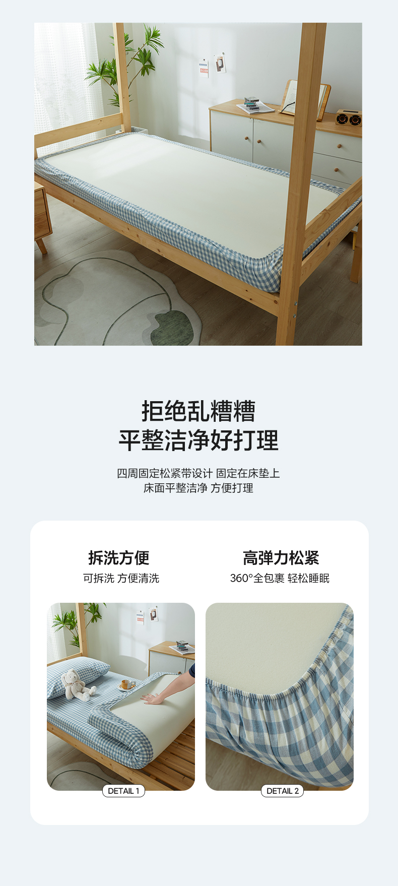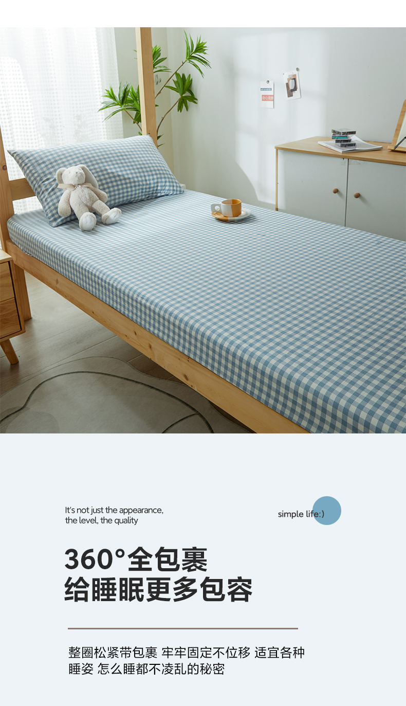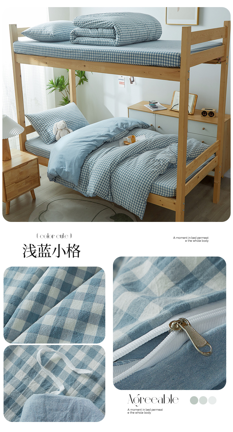 九沐良品 新款A类全棉水洗棉宿舍三件套 浅蓝小格