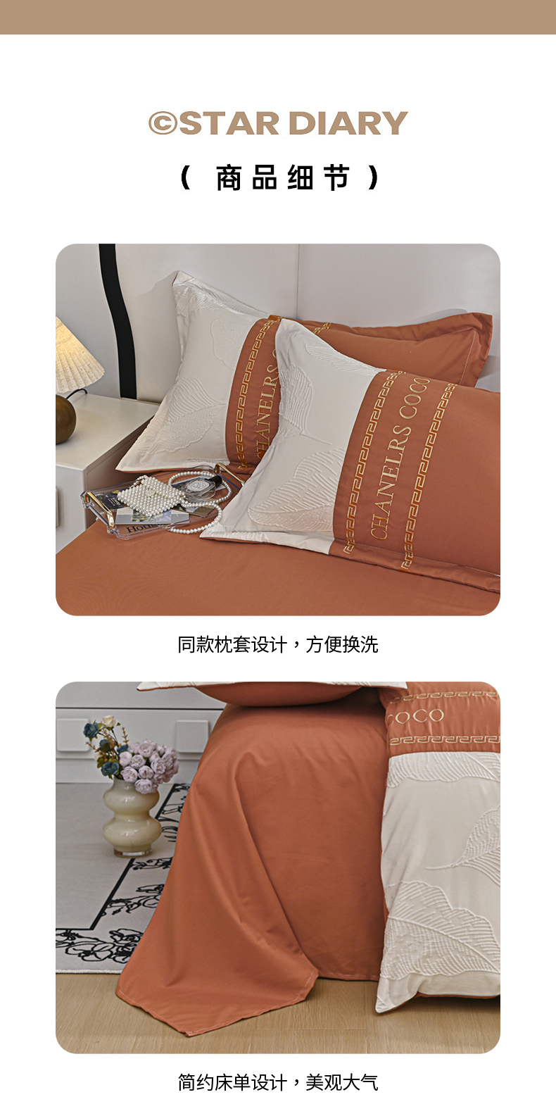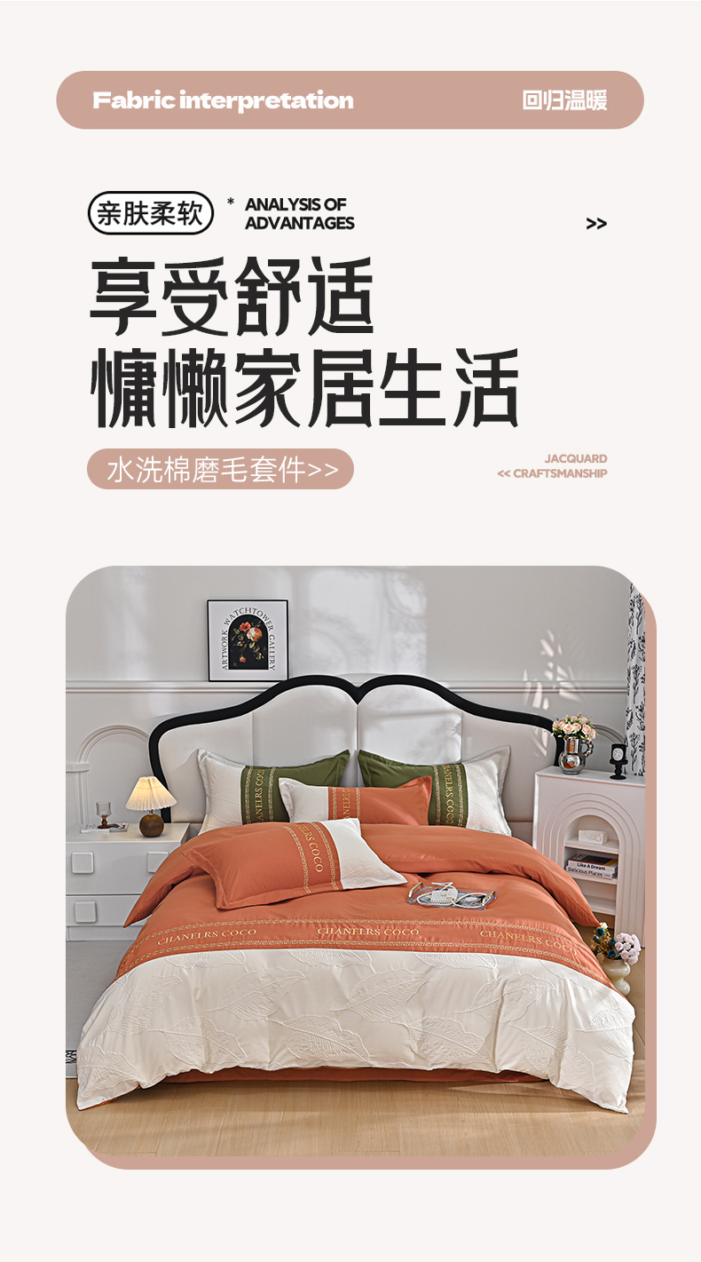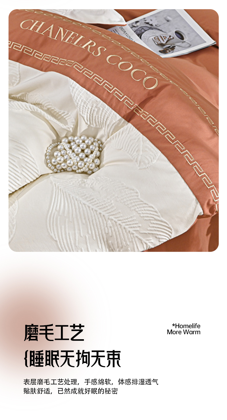 富宁家纺 2025新款直播爆款水洗棉磨毛浮雕刺绣四件套-卡诗(提供买家秀) 橙叶子