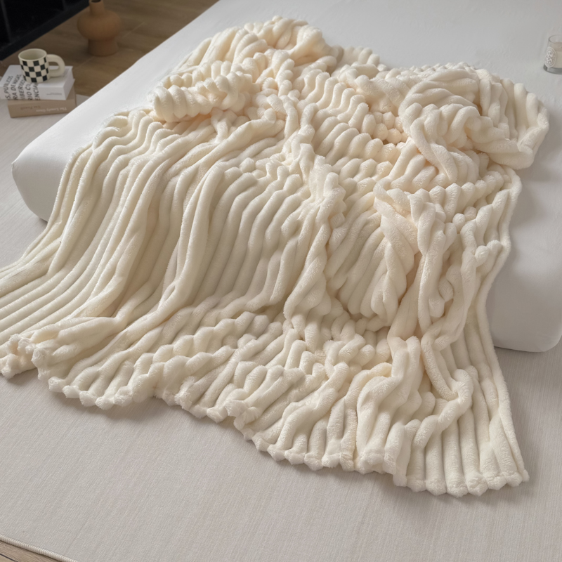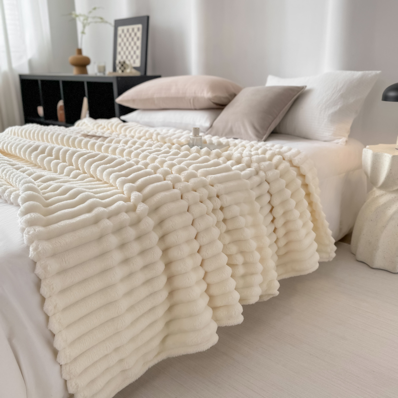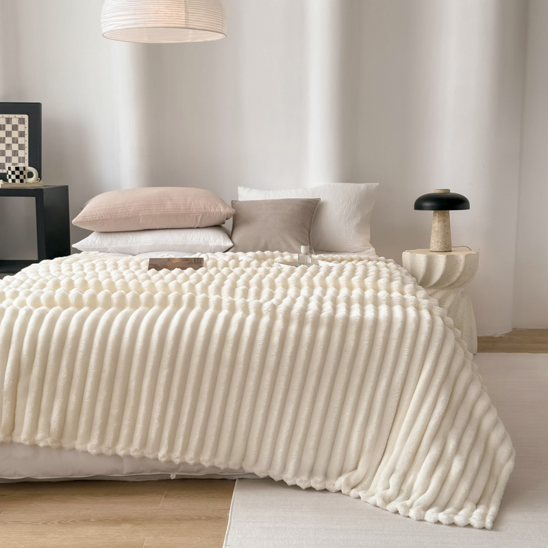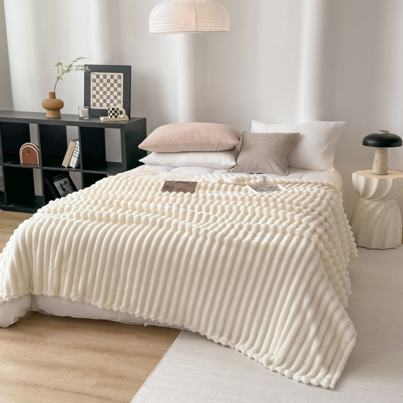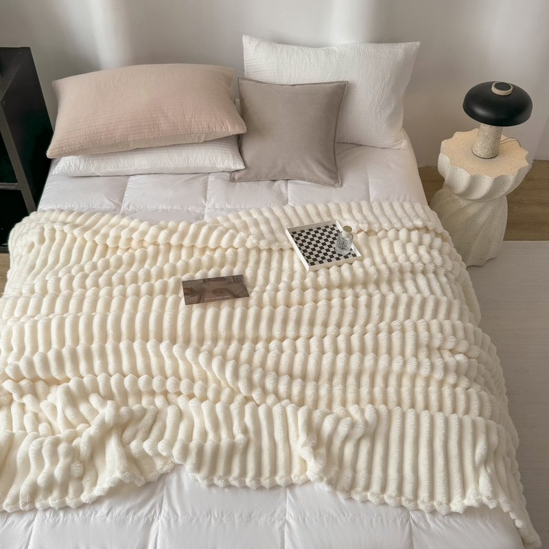羋多 2024新款跨境仿兔毛绒多功能毛毯高克重魔法绒4公分宽抽条毛毯 云母白