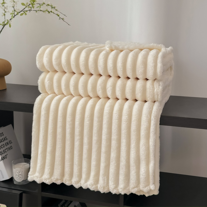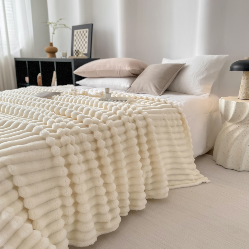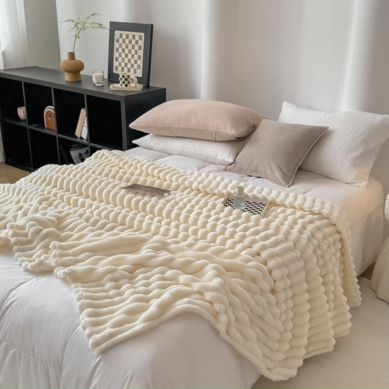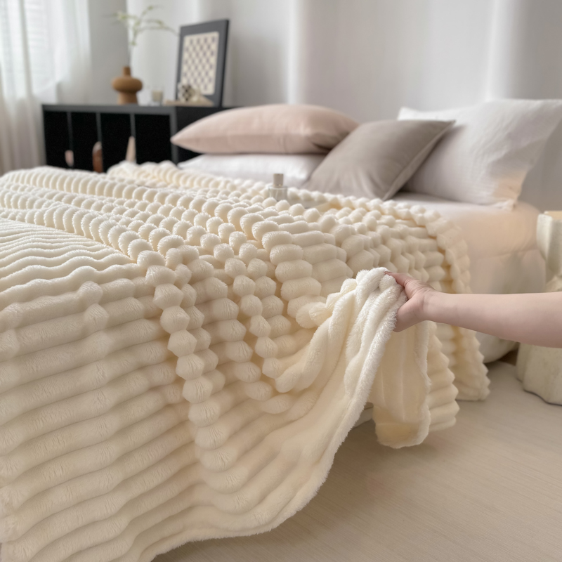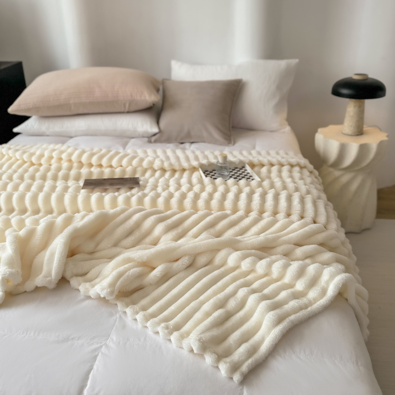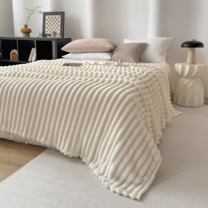 羋多 2024新款跨境仿兔毛绒多功能毛毯高克重魔法绒4公分宽抽条毛毯 云母白
